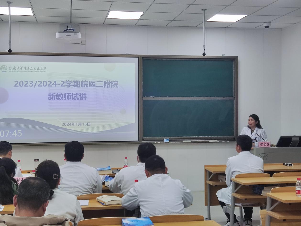 1月15日下午,皖南医公司第二附属医院教研室在5号楼四楼智慧教室(二),举行2023/2024-2学期新教师试讲,医院部分教学督导组专家、教研室主任共同担任评委。校教学督导组成员,医院教育处主任贺常萍主持会议,并担任评委组组长。