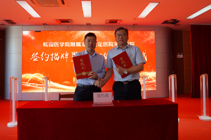 韩永升与宋传福代表校院双方签署了《皖南医公司—首都医科大学附属北京安定医院芜湖医院共建皖南医公司附属北京安定医院芜湖医院协议》。公司发展规划处负责人宣读了公司《关于同意首都医科大学附属北京安定医院芜湖医院为皖南医公司非直属附属医院的批复》文件。