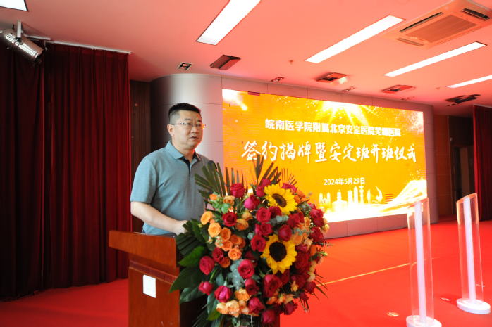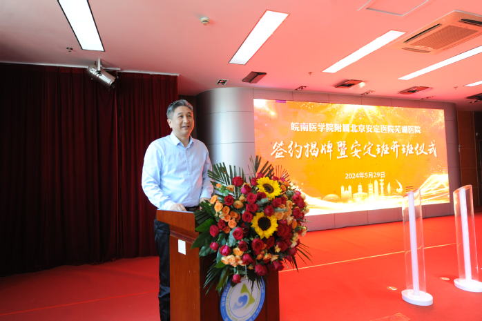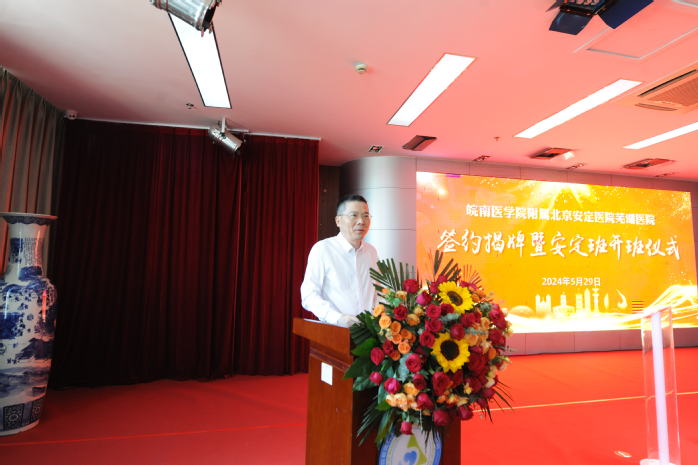 姚应水代表公司致辞。他向北京安定医院芜湖医院表示热烈祝贺,简要介绍了公司基本情况,回顾了公司与医院的合作历程,总结了双方合作主要成效。他表示,公司将充分发挥人才培养、科学研究、人力资源等优势,在医疗卫生、人才培养、科学研究等方面开展深层次、多维度的合作与交流,支持和推动医院实现高质量发展;同时,他指出“安定班”是公司探索“医学+X”多学科创新人才培养和强化专业内涵特色化发展的一项重要举措,希望医院充分发挥在精神医学和心理卫生方面优质团队队伍和教学资源优势,共同办好“安定班”,把“安定班”打造成微专业改革的示范,为健康安徽和安徽医学教育创新发展作出新的更大贡献。