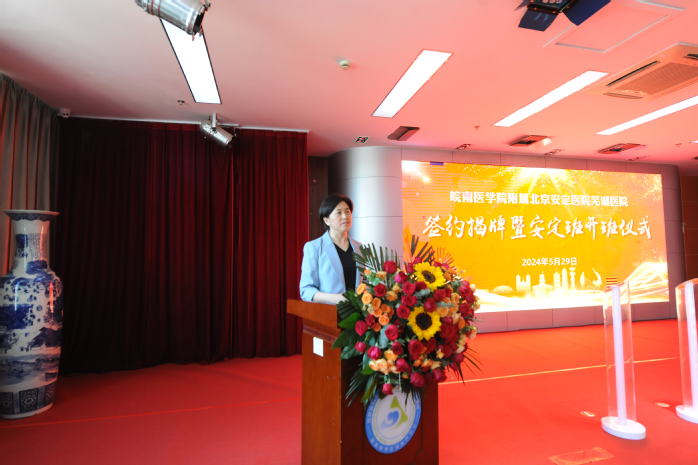 丁百静代表芜湖市人民政府致辞。她对医院成功获批皖南医公司非直属附属医院表示热烈祝贺,指出此次合作是双方在前期紧密对接基础上结出的硕果,既是校院优势互补、双向奔赴的“再携手”,更是强强联合、共赢未来的“再出发”,芜湖市将全力支持双方在人才培养、医疗服务、科学研究等方面的交流与合作,期待双方发挥自身特色与优势,加快推进内涵式高质量发展,为芜湖市经济社会发展提供更高质量的医学人才和更高水平的医疗卫生健康保障,更好地满足芜湖市和皖南人民对高品质健康医疗卫生服务的需求,全力增进百姓健康福祉。