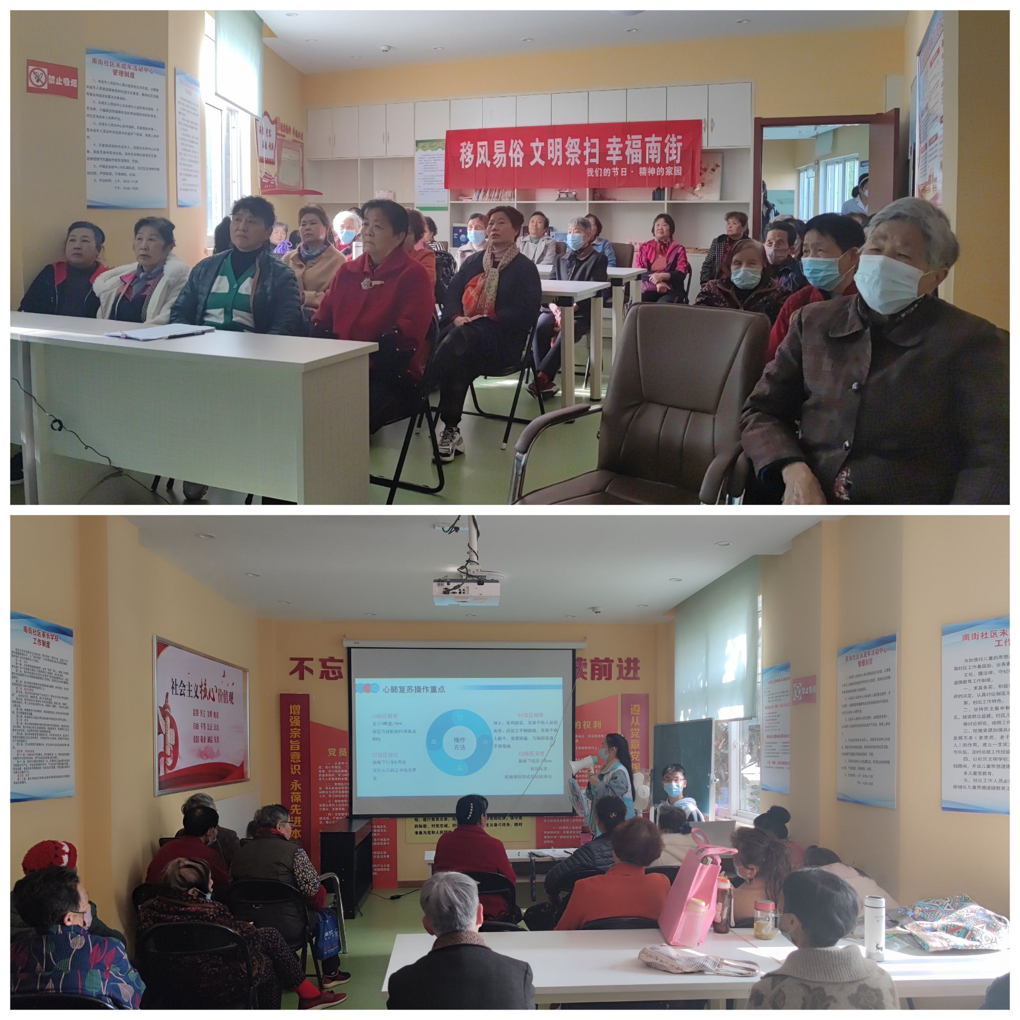 爱心义诊结束后,志愿者们在南街社区居家养老中心组织开展了春季常见病宣讲会。宣讲会上,志愿者们普及了春季常见病(如甲流等)和部分老年性疾病的病因、临床症状、常见治疗方法等,并叮嘱居民及时了解自己的身体状况,做好相关疾病的预防。广大居民对志愿者的专业解答和热情帮助给予了高度评价。