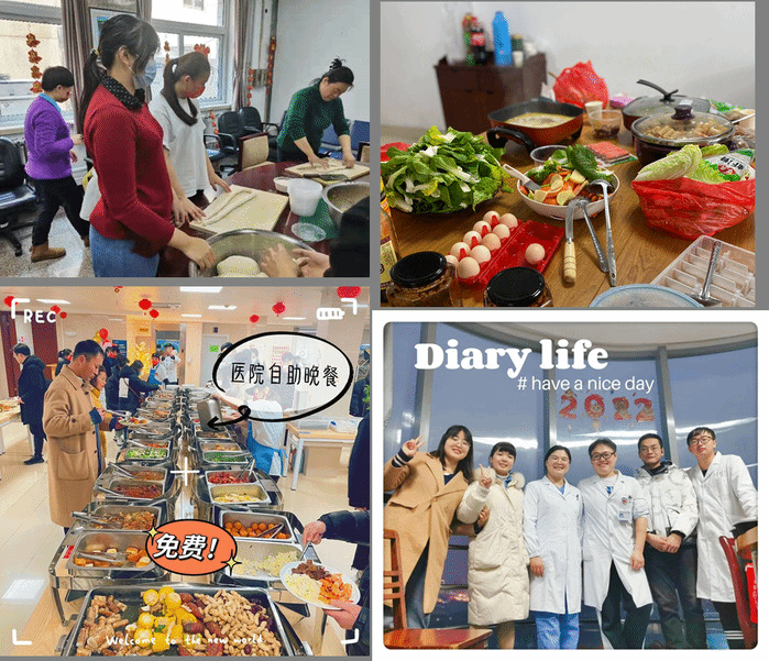 节前,公司走访实习点为同学们送去祝福;除夕夜,北京普仁医院组织师生共同包饺子;江苏溧水人民医院为同学们送去了新年祝福和热腾腾的饭菜;第一附属医院为同学们准备了免费的豪华自助餐……同学们虽然无法与家人团聚,但是医院的周到考虑和细致关怀让每一位“就地过年”的实习生感受到了浓浓的节日氛围,让同学们过上了一个欢乐祥和的新春佳节。