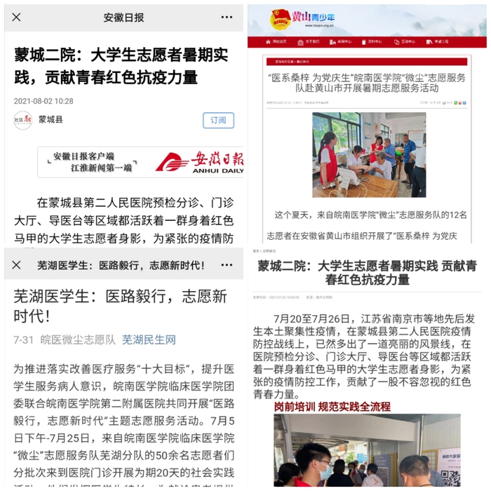 为深入贯彻落实习近平总书记关于青年工作的重要思想,引导和帮助广大青年员工上好理论与现实相结合的“大思政课”,在社会课堂中受教育、长才干、作贡献,在观察实践中学党史、强信念、跟党走,努力成为担当民族复兴大任的时代新人,以实际行动庆祝中国共产党成立100周年,暑期期间,2019级组建实践团队67支,并遴选出“微尘”和“医系桑梓”2支重点队伍,,组织约750名志愿者奔赴安徽、江苏、新疆等多个省份的基层、社区和乡村,以团队为主、个人为辅的实践方式,积极开展以理论宣讲、关爱留守儿童、关爱空巢老人、疫苗接种等志愿服务为主题的社会实践活动,受到安徽日报、黄山日报、黄山团市委、芜湖民生网等多家媒体的报道。