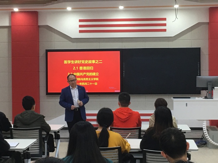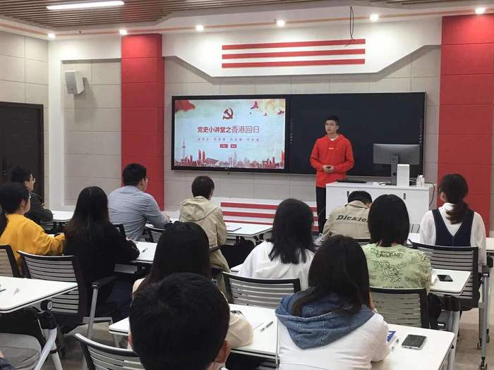 首先,员工党员袁成以港澳回归为主,以“七子之歌”为切入点,结合视频向大家讲述了香港、澳门回归的历史故事,阐述了“一国两制”方针内容和内涵。