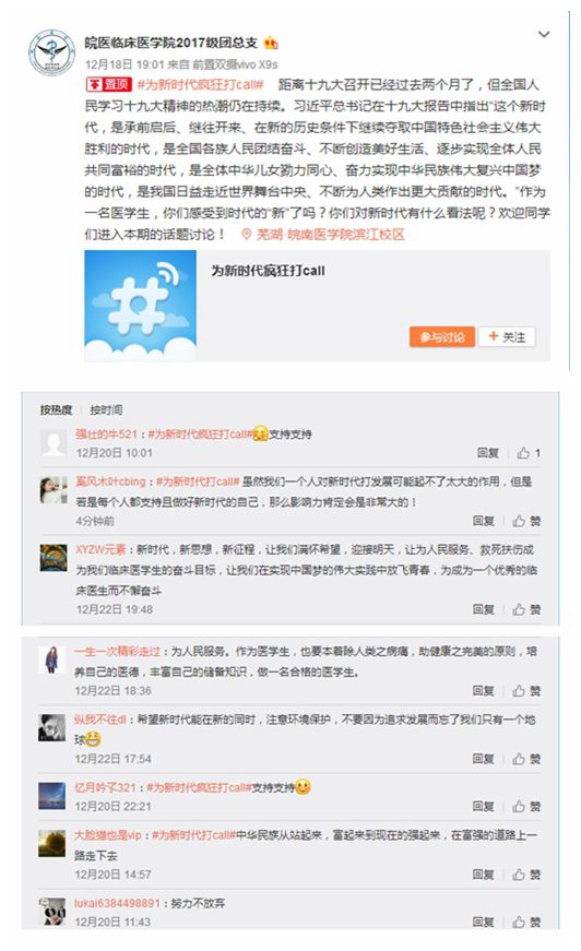 本次十九大精神学习活动由各团支部通过知识问答、主题学习微博话题等形式,为团员青年介绍习近平新时代中国特色社会主义思想的丰富内涵和历史地位,使同学们了解我国社会主要矛盾的新变化,领会中国特色社会主义进入新时代的重大政治判断。在组织专题学习的同时,2017级团总支还积极组织开展微博话题讨论,同学们通过微博平台进行互动,发表自己对时代之新的见解。同学们纷纷表示,对医员工来说,学习是立身之本、成事之基、创新之源,只有通过不断的学习,不断用新思想、新观念、新见解丰富和提升自己,才能与时俱进,才能适应社会发展需要,提高自身水平,为国家做出贡献。