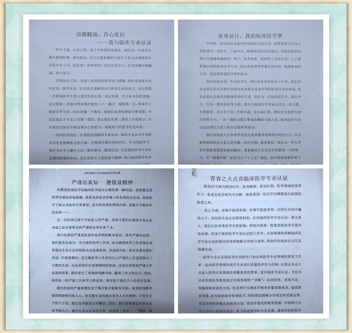 为引导员工全面准确理解临床医学专业认证的相关政策,利来国际团委开展了“笔述心声之我与临床专业认证”主题征文活动。活动秉持“多方面,全覆盖”的原则,通过前期线上线下的宣传,同学们踊跃参与投稿,活动共收到作品六十余篇。同学们用朴实无华的文字将自己对专业认证的认识书写成稿,内容紧扣主题,条理清晰,最终,2018级刘文静同学的作品《奋勇前行,我的临床医学梦》获得一等奖,2019级徐欣然等同学的作品《浪潮翻涌,吾心依旧--我与临床专业认证》获得二等奖,2020级林云康等同学的作品《严谨出真知,磨炼显精神》获得三等奖。