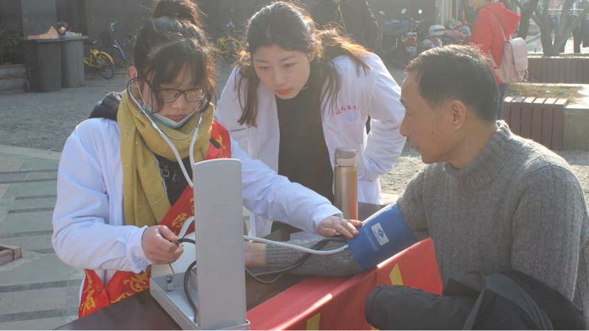 阳光和煦,微风轻柔,3月10日早8点,志愿者们或走进社区,摆开桌椅,拉起横幅,不急不躁认真细致地为社区居民测量血压,期间不乏志愿者们亲切的问候与关怀;或走上街道,积极分发传单,认真介绍春季流行疾病防控知识,指导人们做好预防措施,热心提醒社区人员注意合理饮食,并引导他们前往志愿服务台测量血压,关注身体健康状况;或耐心仔细地教老人们十式手部健康操,为其进行按摩解乏,并结合所学知识对老人提出的常见健康问题做出针对性解答,幸福的微笑洋溢在老人的脸庞。点滴活动,汇聚成集,丝丝奉献,传承千里,志愿者们以其饱满的热情与严谨的工作态度赢得了广大南街社区居民的夸赞与认可。