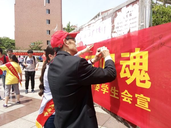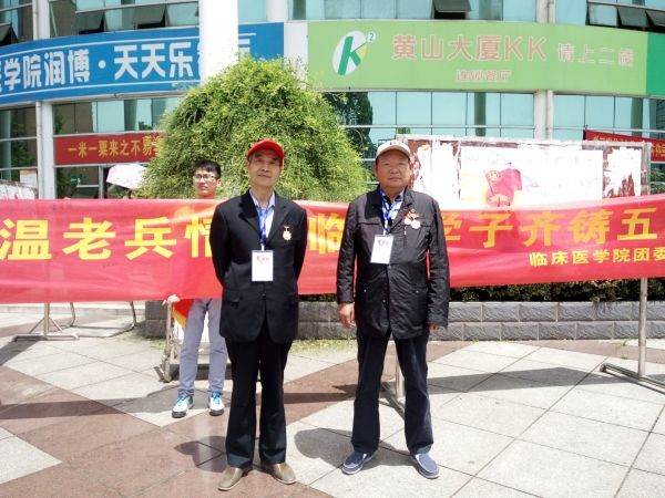 此次活动共展出17位抗战老兵的图片,介绍了他们的从军经历、部队番号等。两位老兵更是亲临展览现场与公司学子进行互动,讲述他们的抗战岁月和艰苦经历。活动期间,公司志愿者们对前来瞻仰老兵事迹的同学们给予耐心的介绍,深受感染的同学们络绎不绝地在写有“校社联手共温老兵情,临床学子齐铸五四魂”的横幅上签字,为抗战老兵献上最诚挚的敬意。两位老兵也在横幅上写下了自己的期望,“年青一代是祖国的未来”解放军战士周耀先写道。