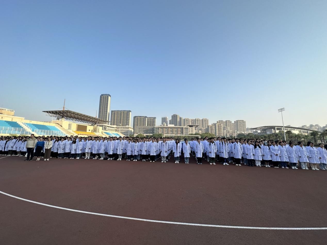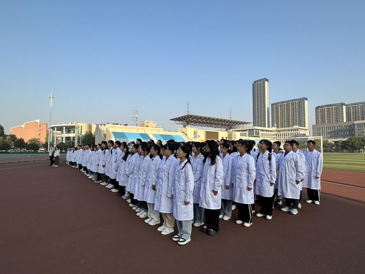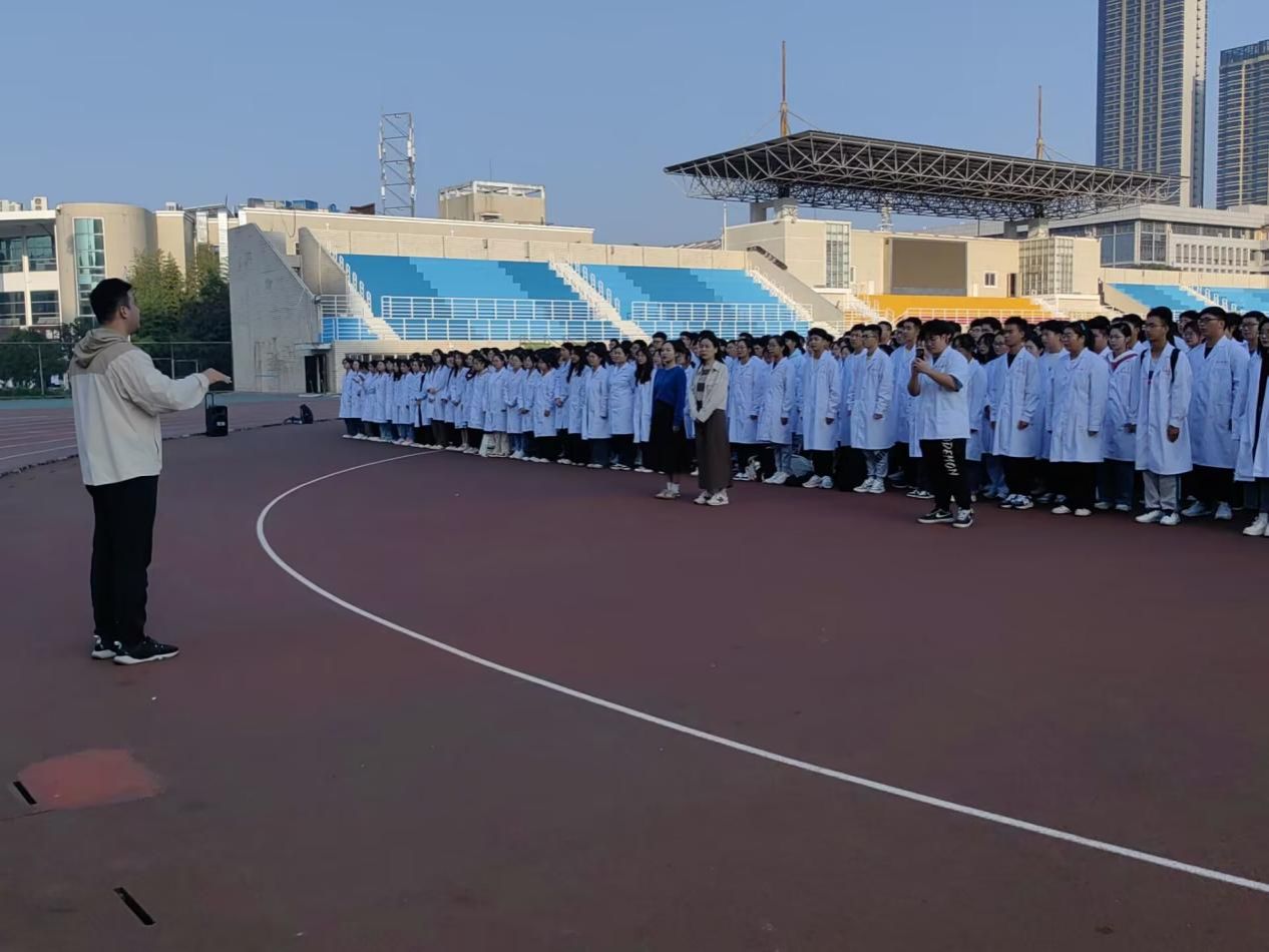 年级辅导员苏曹骢带领全体师生面向飘扬的国旗齐声唱响《歌唱祖国》,用嘹亮的歌声传递着皖医人对祖国的深情祝愿。