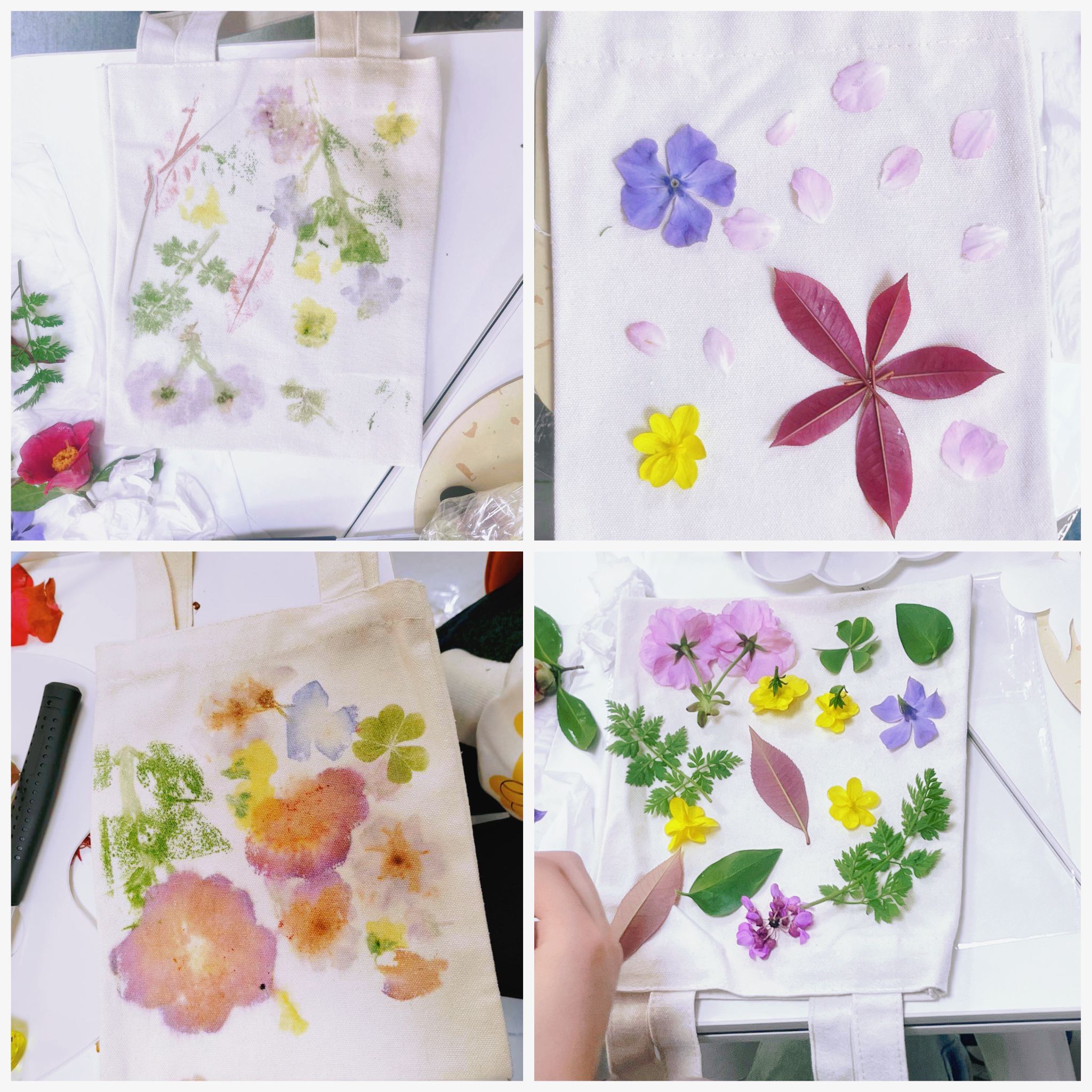 拓花草,染春天。“草色锤染身上衣,映红犹闻彩花香。”历经千年历史变迁,植物拓染已成为非遗名录中的一项特殊技艺。活动伊始,在工作人员的指导下,同学们将明矾浸泡好的花草摆放在空白帆布包上,粘贴牢固后用拓染锤反复敲打,使植物汁液渗入布料之中,从而得到一朵朵、一簇簇“彩印”的花草。同学们在体验实践的过程中充分发挥自身的主观能动性,感受美、创造美,拓染下自己对于春天的美好期待。