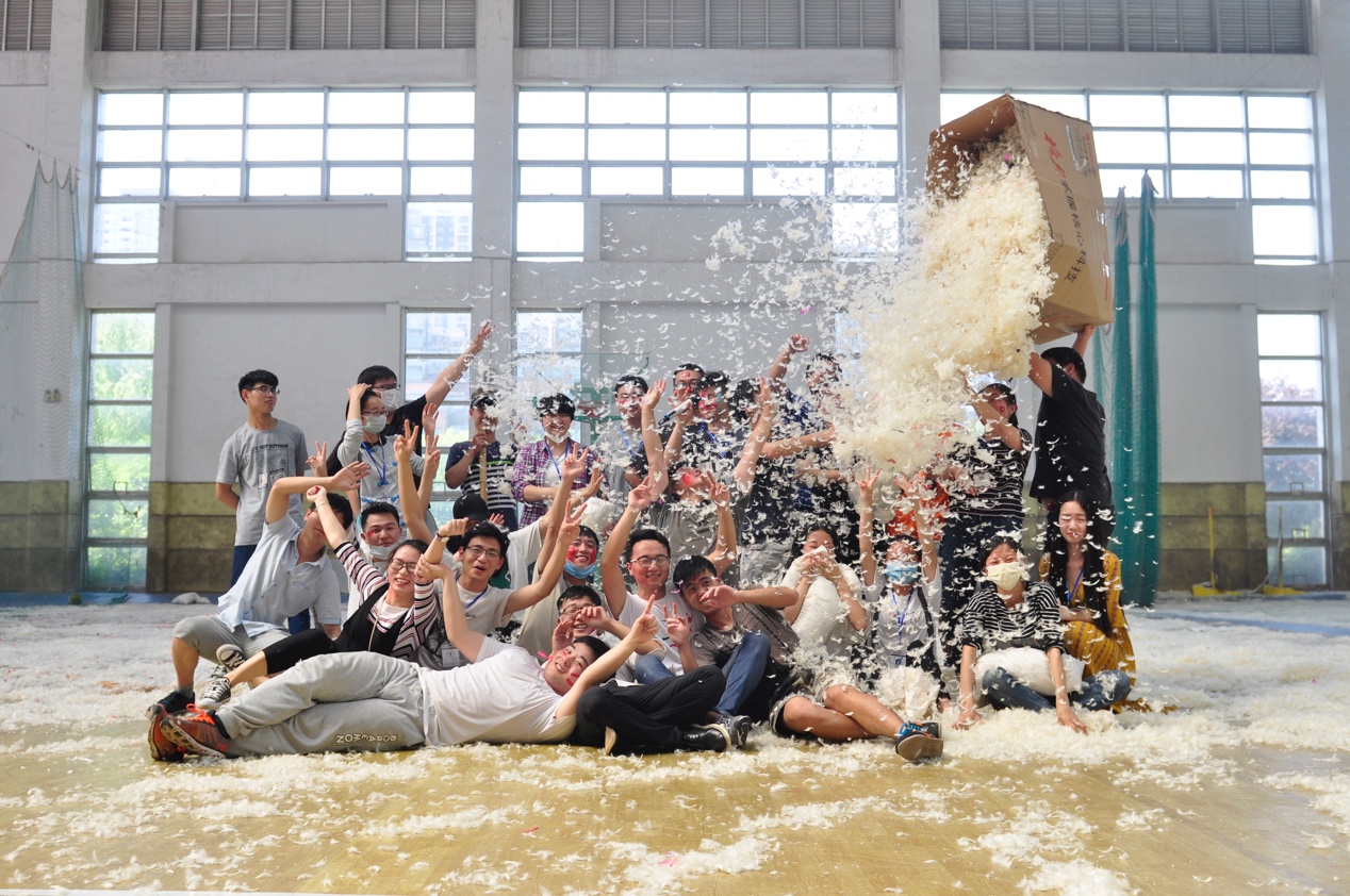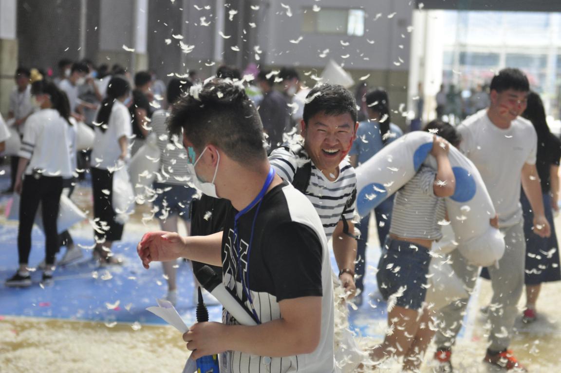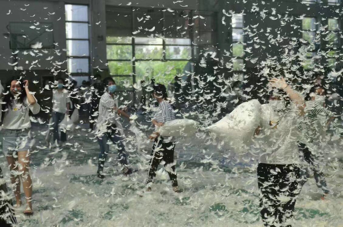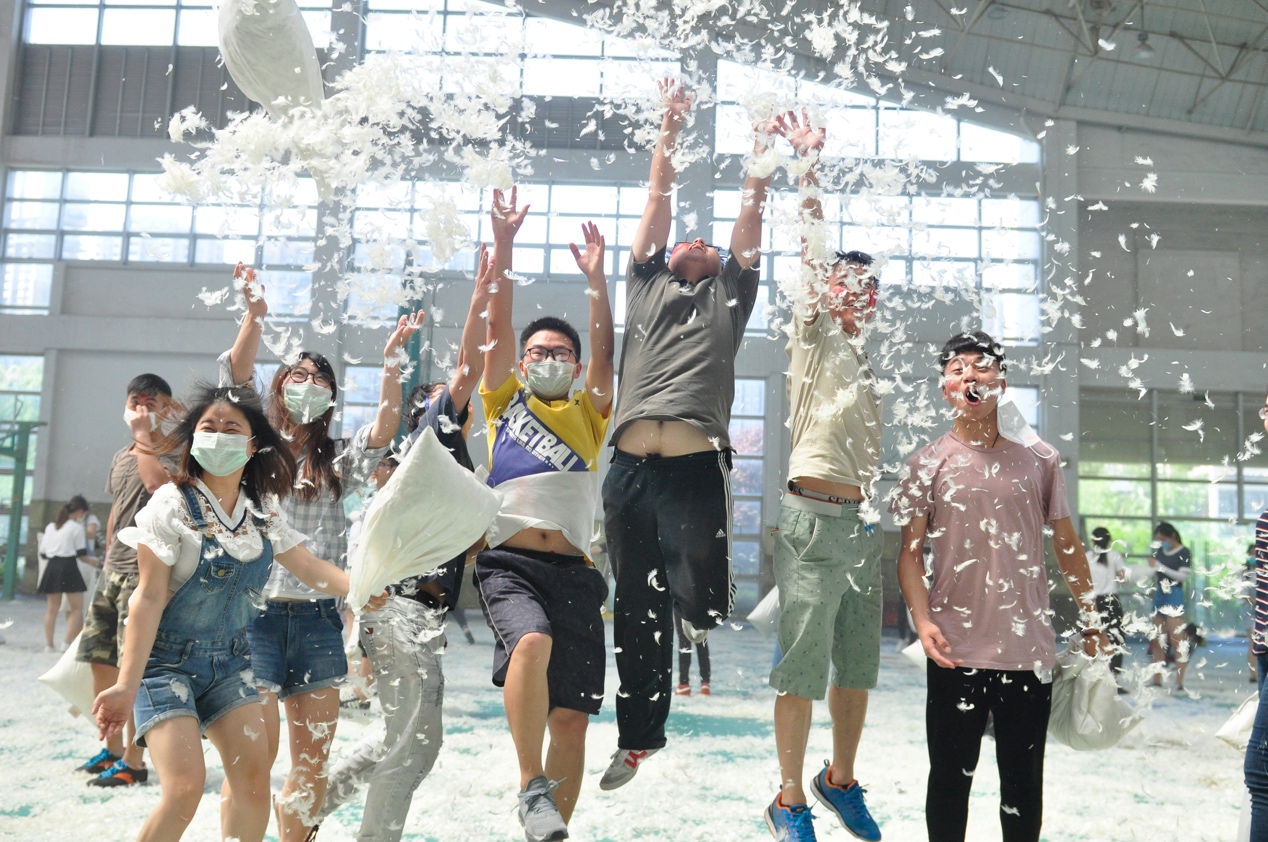 经过前期的精心筹备,“抛开烦恼,快乐生活”枕头大战活动于5月13日下午两点正式“开战”。活动当天,现场布置精美,上千只气球布满体育馆。伴着动感十足的音乐和同学们的欢呼声,“地球大爆炸”、“谁动了我的枕头”、“枕头撞地球”等暖场游戏项目依次展开。中场休息时间,活力四射的青春热舞将活动气氛推向了高潮。随后,精彩有趣的游戏继续进行。个人项目“单挑英雄会”让同学们笑得开心,玩得尽兴;多人项目“两人三足”和“枕头森林”则让同学们感受到了团队协作的魅力。最后的“大混战”是本次活动的主体项目,同学们拿着枕头你追我赶,在漫天飞舞的羽毛中释放压力、交流感情、增进友谊。最后,枕头大战在同学们的欢声笑语中圆满落幕。