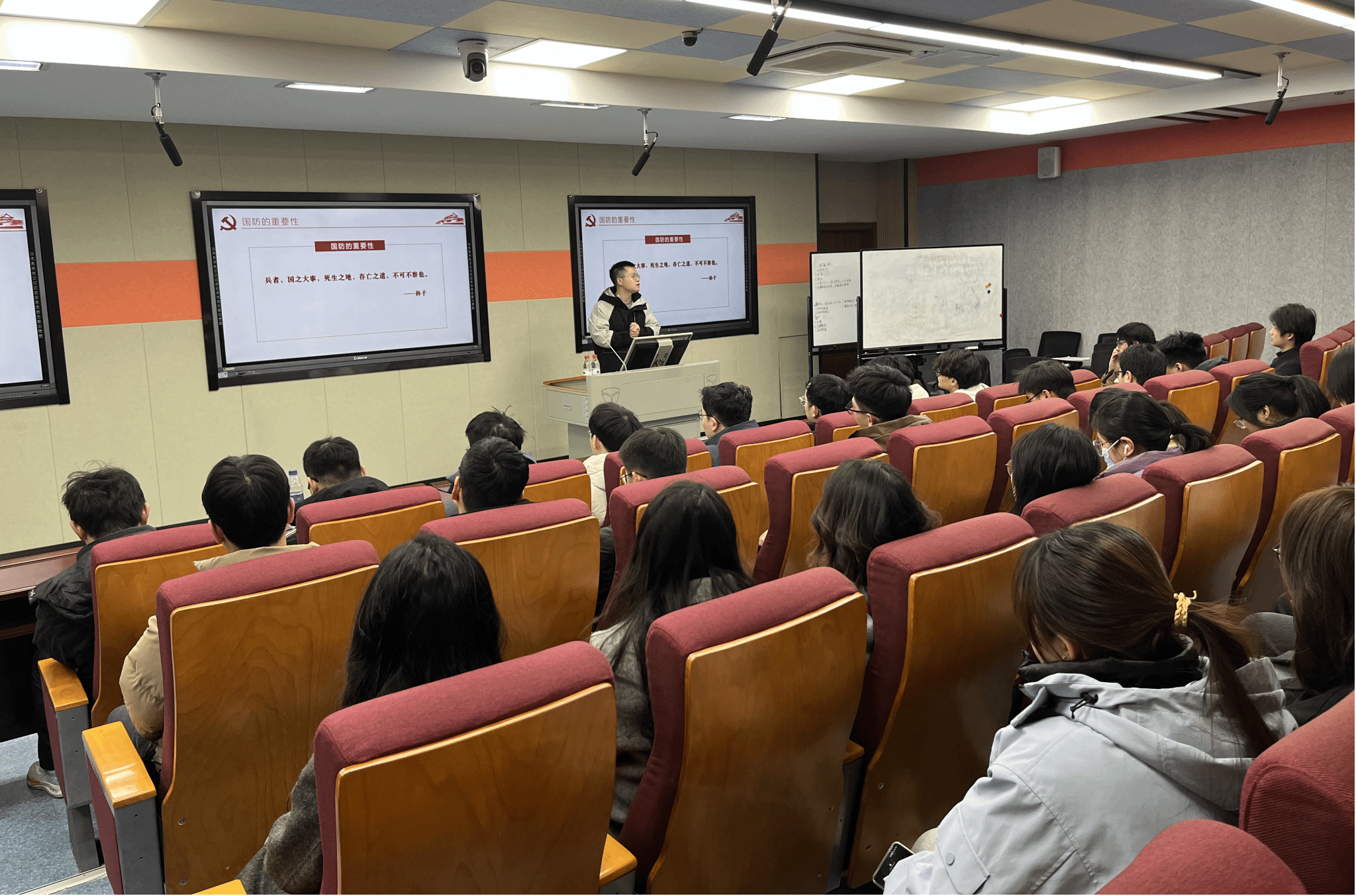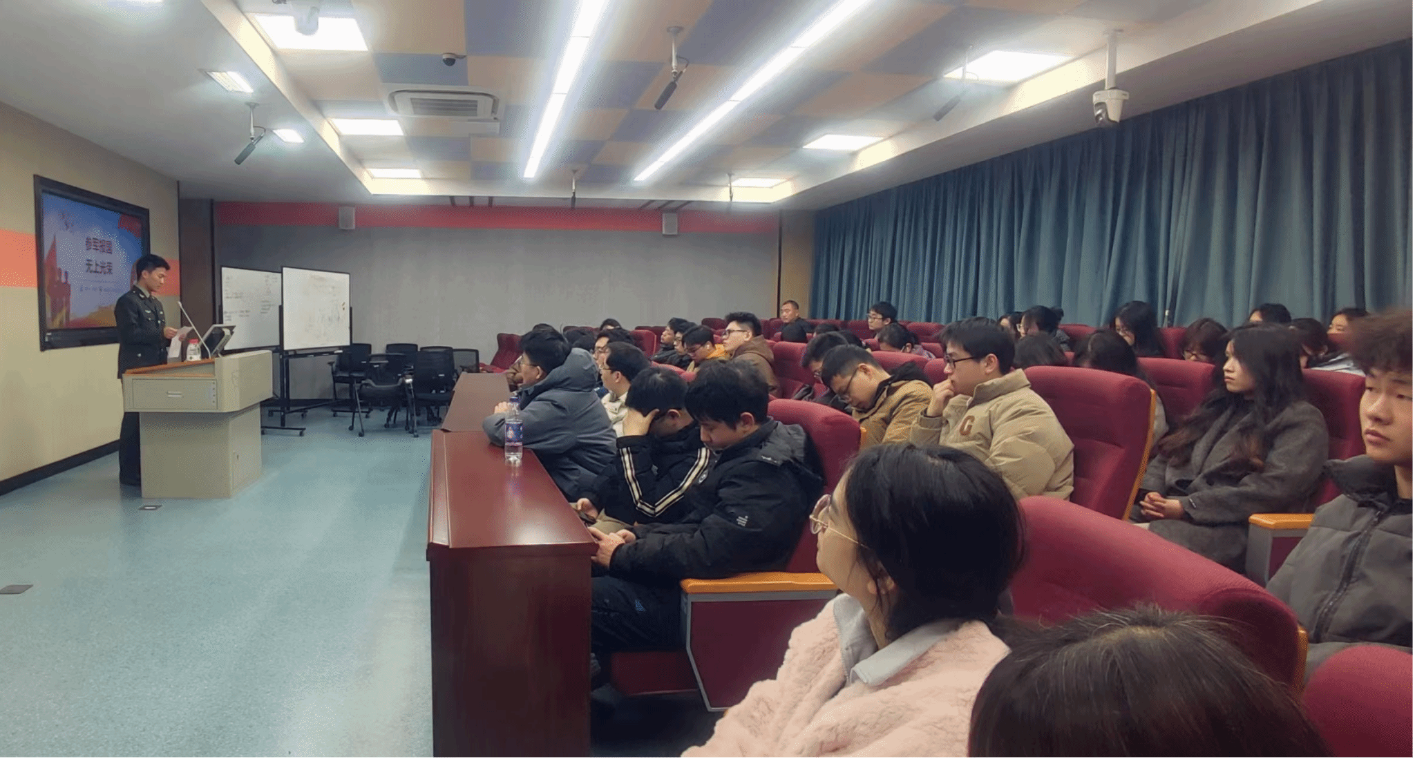 武宇洋老师详细解读了老员工应征入伍的意义、应征条件、入伍政策、发展前景、退役安置和经济待遇等方面内容,帮助同学们更深切体会党和国家对军人的优惠政策,勉励同学们积极响应党和国家号召,投笔从戎,勇担重任。刘俊同学结合自己在部队的经历以及收获和现场同学进行了交流分享,鼓励同学们积极响应国家号召,投身国防事业,为国家的繁荣富强贡献自己的力量。