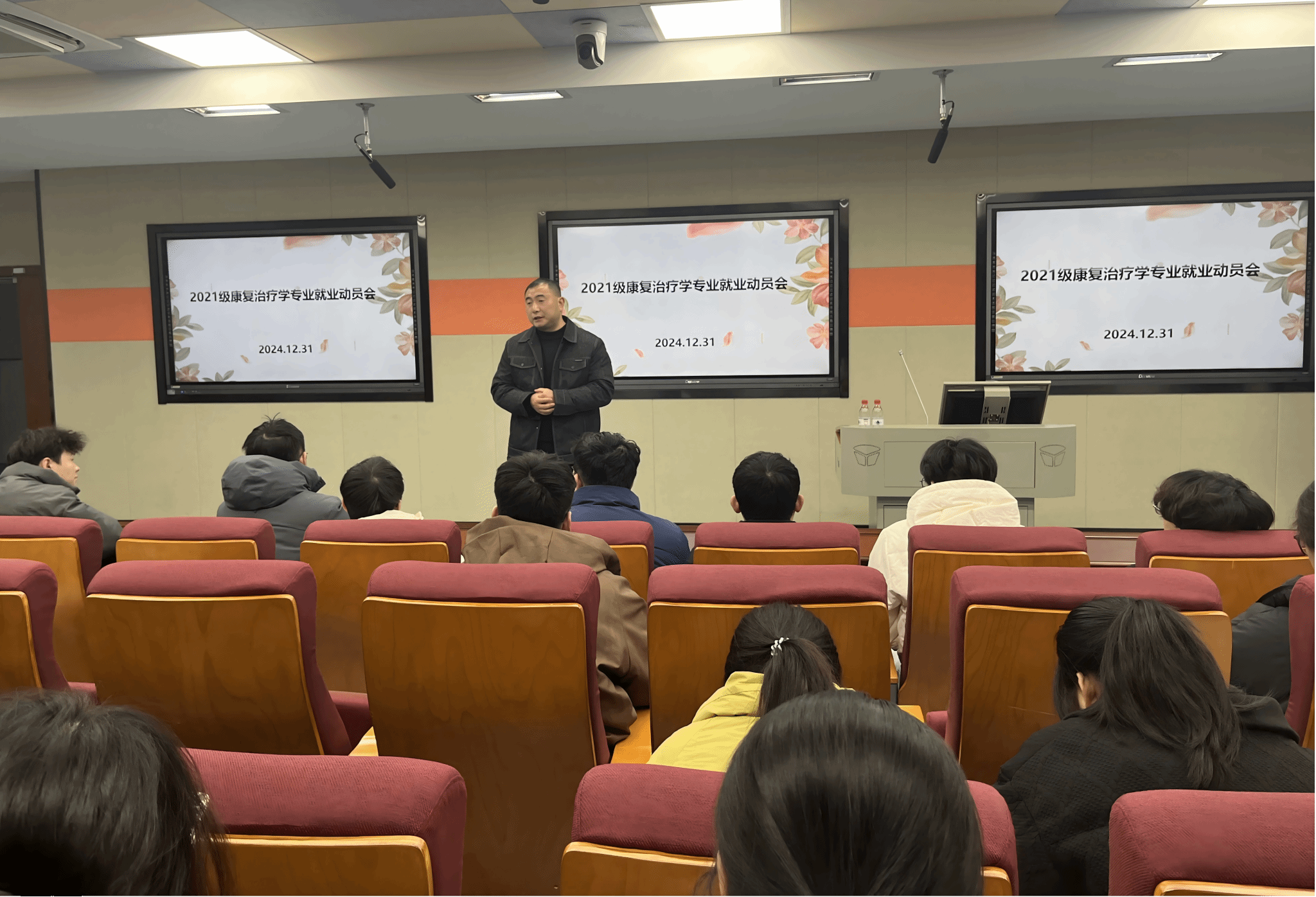 为响应党和国家号召,积极宣传征兵入伍政策,鼓励大学毕业生参军入伍报效祖国,2024年12月31日晚,利来国际举办2025年征兵动员宣讲会,邀请员工工作部武宇洋老师和退役复学员工刘俊主讲,2020级临床医学、2021级康复治疗学专业70余名同学参加会议。