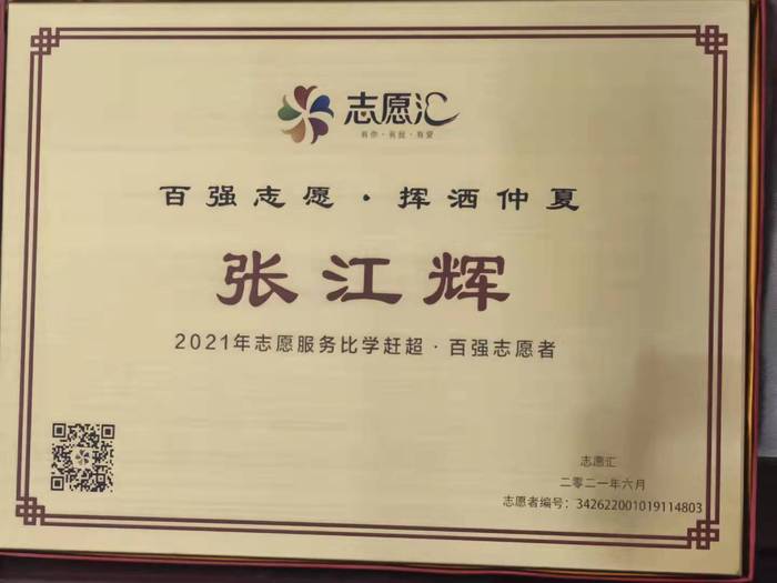 青年躬行路,实践出真知。春芽志愿服务队负责人张江辉同学于2017年成为在册志愿者后,积极参与开展志愿服务。在本次百强志愿服务评比中,于万名志愿者中脱颖而出,以第十名优异成绩荣获“全国百强志愿者”。