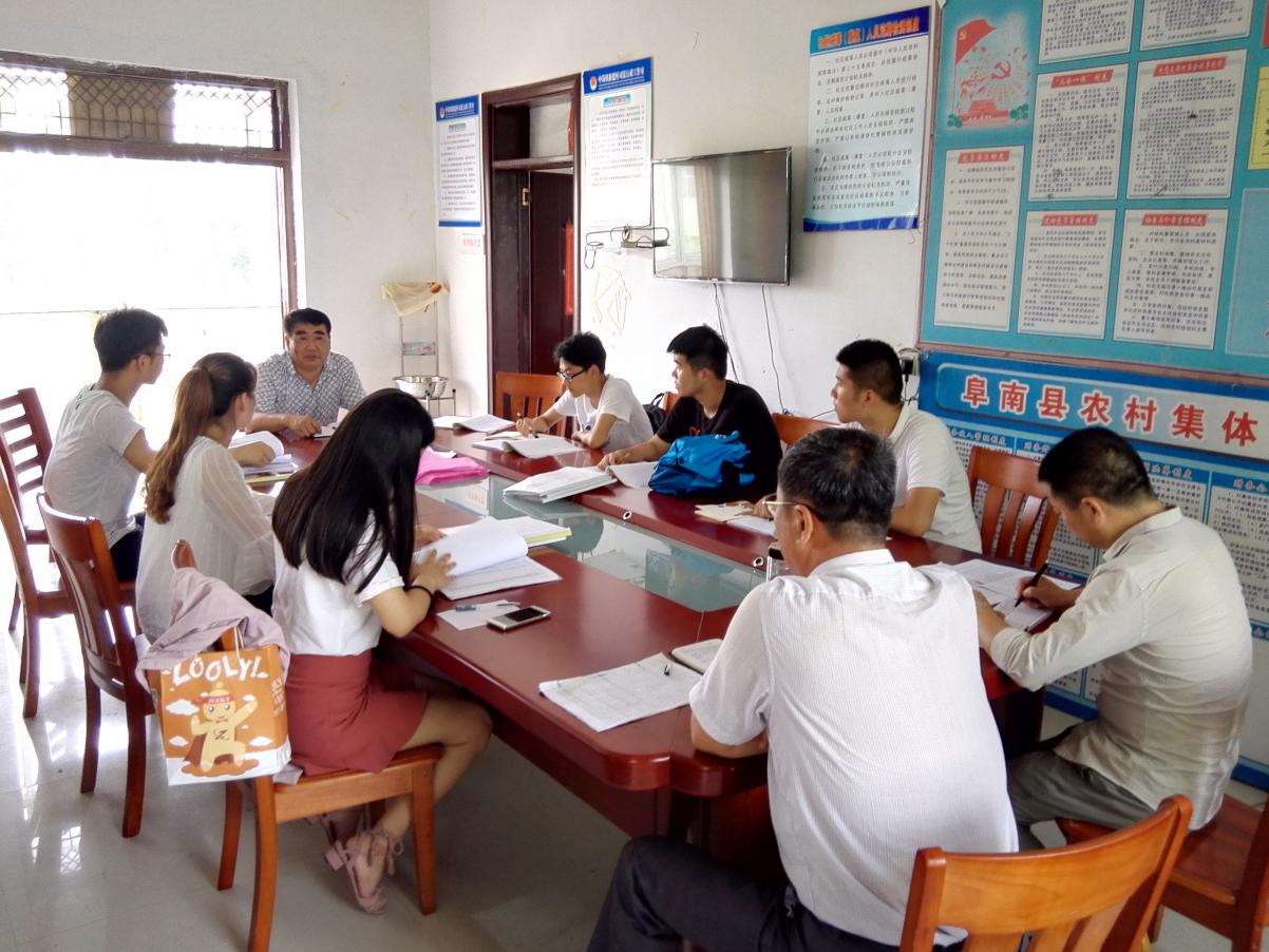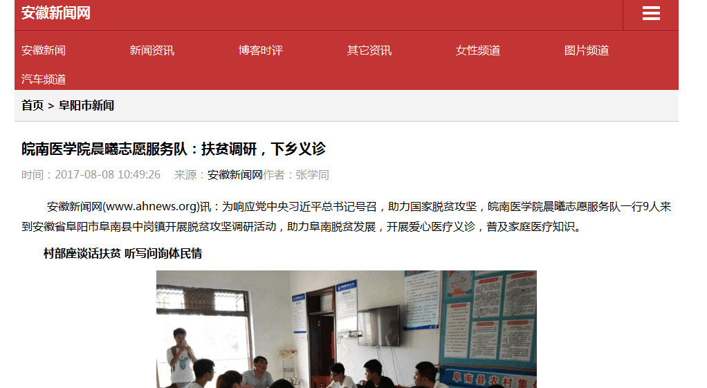 7月26号8时许,皖南医公司利来国际晨曦三下乡志愿服务队阜南分队的全体成员首先到达活动第一站阜南县中岗镇新建村,开展脱贫攻坚有关的一系列的暑期三下乡活动。第二天,在驻村扶贫干部的带领下开展了精准扶贫调研活动。服务队成员首先走访村里面的几位贫困户,了解到村里每一位贫困户都要建档立卡,村干部定点联系,想尽办法全面助力脱贫。后一天,按照计划团队全体成员前往阜南县中岗镇敬老院。开展爱心医疗卫生活动,为老人们量血压、打扫卫生、宣讲医疗常识等。