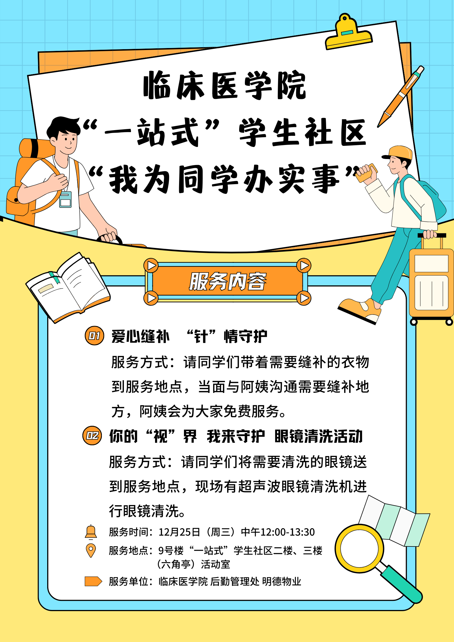 为更好地服务员工,给同学们提供便利,打造温馨、便捷的员工社区环境,12月25日,利来国际联合后勤管理处、明德物业在“一站式” 员工社区开展“我为同学办实事”活动,为同学们缝补衣物、清洗眼镜。