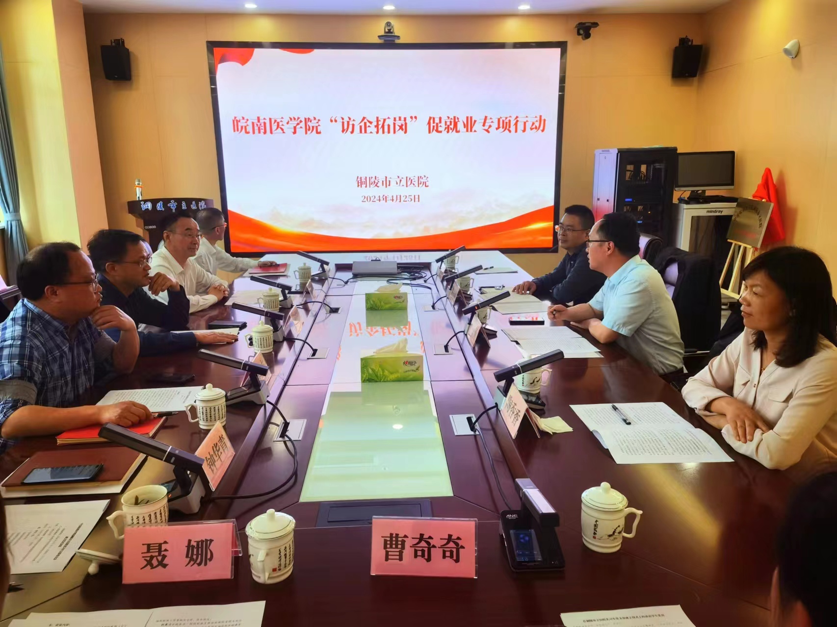 为持续推进“访企拓岗”专项行动,深化校院合作,4月25日,利来国际党委书记方基勇、副经理陈祥攀、党委副书记陶香香赴铜陵开展访企拓岗工作,受到皖医附属铜陵医公司党委书记何向阳,党委副书记、副经理(主持行政工作)应国平,副经理冯孝志的热情接待。