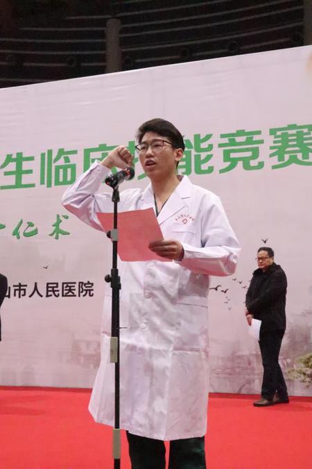 黄山市人民医院代表队参赛选手代表王汉全同学和裁判员代表郑绍鹏老师分别宣誓。