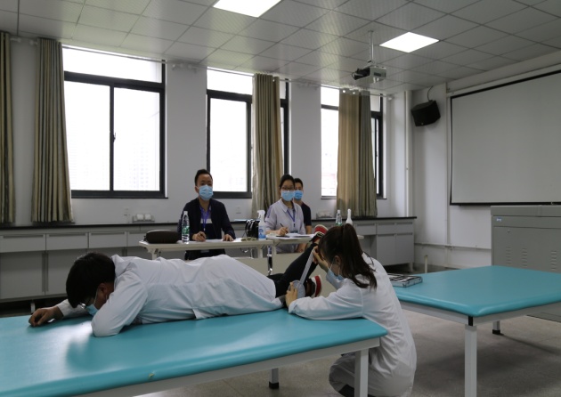 本次技能考核采用站点式,共设6个站点。考核内容综合康复治疗学专业主干课程中所涉及的重要技能,包括干扰电疗法、关节活动度评定、呼吸训练、肩关节松动术、脑卒中床到轮椅转移和膝关节置换术后评定等,参照执业考试要求,强调员工对常见康复治疗技术的掌握,检验临床实际动手操作能力。考核过程中,每两位同学为一小组,互为SP完成考核项目,每个考场分别有两位考官为同学们进行考核打分,力求做到公平、公正、严肃、认真。