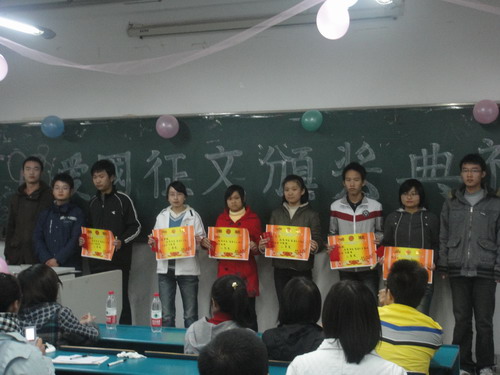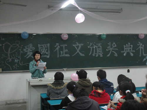 李桂芳老师首先代表年级对此次爱国主义征文活动进行了总结,指出此次活动得到了广大同学的支持,同学们的文章紧绕爱国主题而不失单调,才思敏捷,爱国征文字字掷地有声,展现了同学们的赤诚爱国之心,也展示了新时代老员工心系祖国、报效祖国的远大抱负,通过老师和员工干部的辛勤工作,对征文进行了评比,最终评出了一等间1名,二等奖2名,三等奖6名,鼓励奖11名。随后,2010级员工会副主席奚嘉伟宣布了获奖名单,获奖选手依次上台领奖,并发表了获奖感言,号召同学们不断增强自己的爱国主义意识,踊跃投入到爱国主义行动中来。