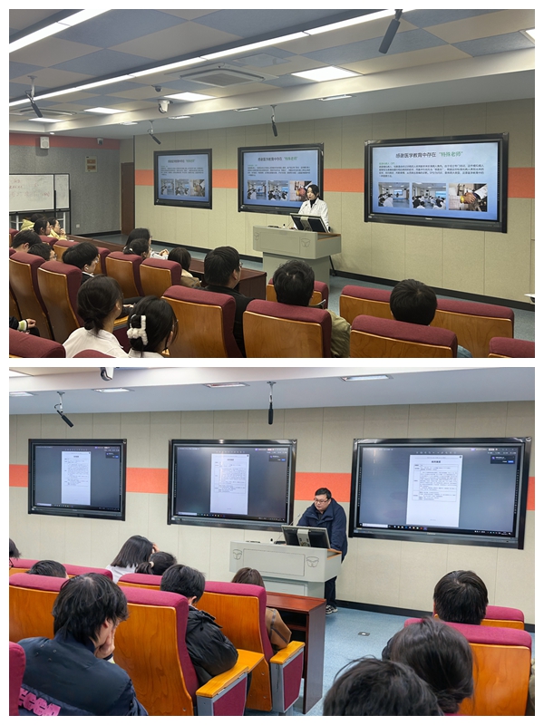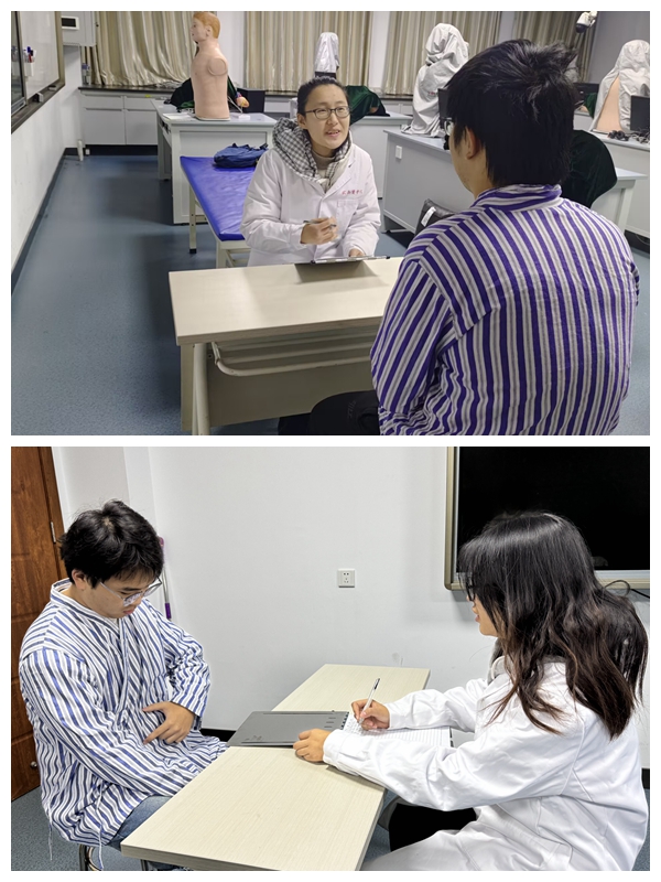 活动前,临床医学实验实训中心教师黄亚纬、宋默涵对所有标准化病人进行岗前培训,分别教授了问诊流程、标准化病人扮演技巧以及本次病例脚本(腹泻)的注意事项。