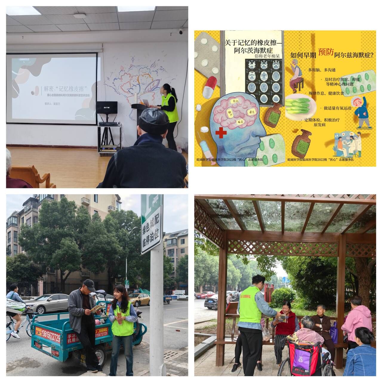 预防老年痴呆,点亮记忆之光。10月16日,“医心”志愿服务队成员一同前往镜湖区镜湖新城社区开展“关于记忆的橡皮擦”阿尔茨海默症科普宣传活动。通过PPT宣讲和发放宣传单的方式让更多老年人了解阿尔茨海默症的症状、危害以及预防方法。此次活动帮助老年人了解了阿尔茨海默症的病因、预防措施,传播了科学的生活方式,提高老年人自我防范意识。