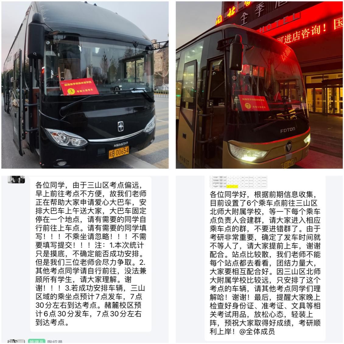 12月23日,公司安排了7辆爱心送考大巴,分别从赭麓校区和5家酒店接送400余名考生前往三山区考点参加考试。同时,辅导员陶绍晨、白桂峰为考研学子送去暖心问候,提醒同学们仔细检查考试用品,鼓励大家沉着冷静、稳定发挥,祝福考研学子“研”途熠熠、一战成“硕”。