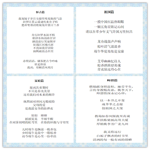 6月5日-6月15日,社区举办“浓情端午 赋诗而来”活动,旨在以诗歌为载体,让社区同学们抒发对祖国繁荣昌盛的美好祝福,倾吐对父母鼓励呵护的感恩,追思古人岸芷汀兰的襟怀。诗歌主题分为祖国篇、师恩篇、家庭篇、怀古篇四个部分,此次活动得到了同学们积极响应,收到100余份作品。