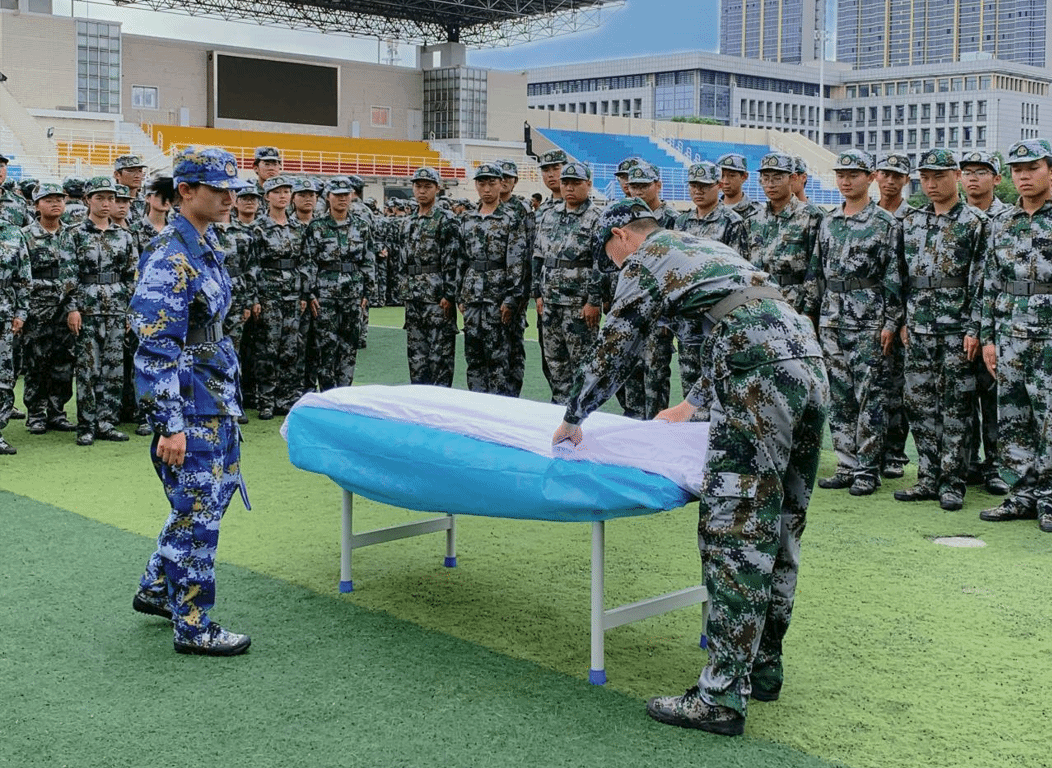 活动现场,教官们以身作则,现场做示范,手把手教学,演示了叠被子和物品摆放的技巧,一床蓬松的被子在各位教官简单的“叠、压、折、挤、捋”几个动作下,变成了有棱有角的“豆腐块”,同学们看到自己“面包式”被子的魔力变身,无一不感到惊叹、敬佩。