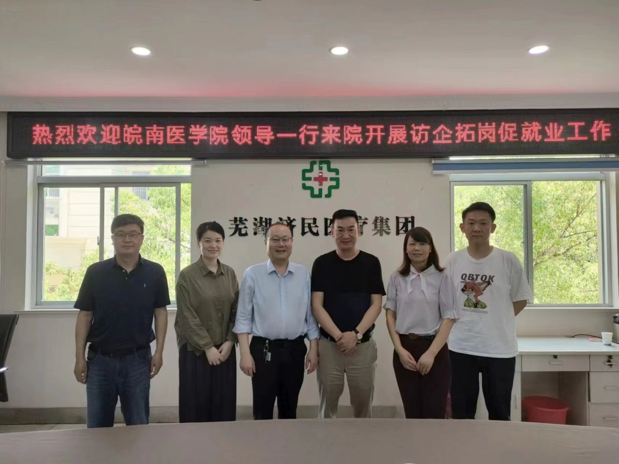 傅万山一行受到芜湖济民医疗集团总经理、无为济民医院经理、无为济民康复医院经理季一柱,无为济民医院业务经理冯善斌,无为济民康复医院经理许静雅的热烈欢迎。洽谈会上,季一柱介绍了该院近几年的招聘用人情况、皖医毕业生在院工作情况等,并介绍2023年度临床医学专业和康复治疗学专业毕业生的需求。傅万山介绍了公司和公司的情况,重点介绍了2023届毕业生情况。最后。双方就下一步实习、就业工作合作进行了讨论。
