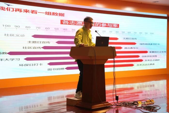 随后,服务队团支书张江辉同学结合自身经历,分享了他参与志愿服务活动的心得体会:“常常有人让我去解释参与志愿服务的意义,我真的是无法回答,如果一定让我去诠释每次活动的意义我想说是感恩。我们每个人都是幸运的,我与在座的各位今天能在这里相遇,绝大部分原因是我们内心都有一颗热衷公益的种子,我也相信在座的同学大部分后续都会参与到我们的志愿活动中来,与一群心有热血、乐于助人的人一起为这个世界加点温度,这是一种幸运。我希望我们临床的学子能共同参与进来,行动起来。当我们进到特殊儿童公司时,“来自星星的孩子”给我们露出灿烂的微笑;当我们进入社区义诊时,群众对我们竖起的大拇指;当我们走上街道宣传疾病防控时,人们投来的感激目光;当我们收到山区儿童来信时,分享他们的喜怒哀乐;当我们走在路上看到志愿者们忙碌的身影,他们的存在让这世间充满善意。我更希望通过我们的努力引领大家坚定信念,鼓励大家勇担时代重任,在社会实践中受教育、长才干、作贡献,争做有理想、有本领,有担当、有作为、有品质、有修养的老员工,以青春建功的实际行动,贡献青春力量。”