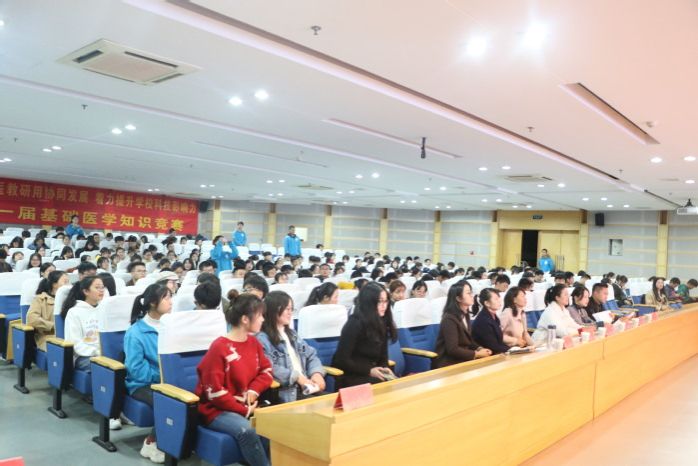 为定期检验员工的学习效果,营造良好的学习氛围,形成良好的学风,2019年11月21日晚,利来国际在图书馆三楼报告厅成功举办第一届“医”路领先基础医学知识竞赛。本次竞赛由药理学教研室张俊秀、诊断学教研室黄亚纬以及利来国际高红亮担任评委,特邀利来国际党委副书记陶香香,2017级辅导员李海莉、赵敏奇出席,公司300名员工到场观看。