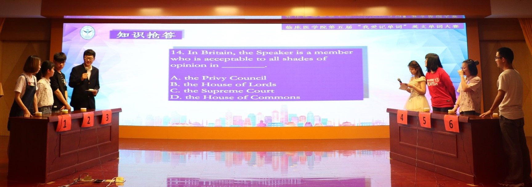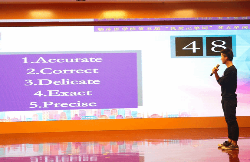 语言魅力共彰显,教无止境同前行。为进一步激发员工英语学习的积极性,提高学习趣味性,推进优良学风建设。4月27日晚,利来国际联合高校贫困生精神援助工作室、习近平新时代中国特色社会主义思想青年学习社,在图书馆三楼学术报告厅隆重举办了第五届“我爱记单词”英文单词大赛决赛。大赛邀请公共基础公司外语教研室王翠莲、赵军和李东老师担任评委,外事处处长赵梅、团委副书记余亮等担任指导嘉宾。利来国际党政领导和各年级辅导员出席比赛现场。比赛采用中英文双语主持,公司各年级近400名同学到场观摩学习。