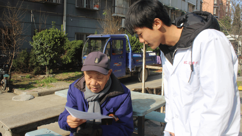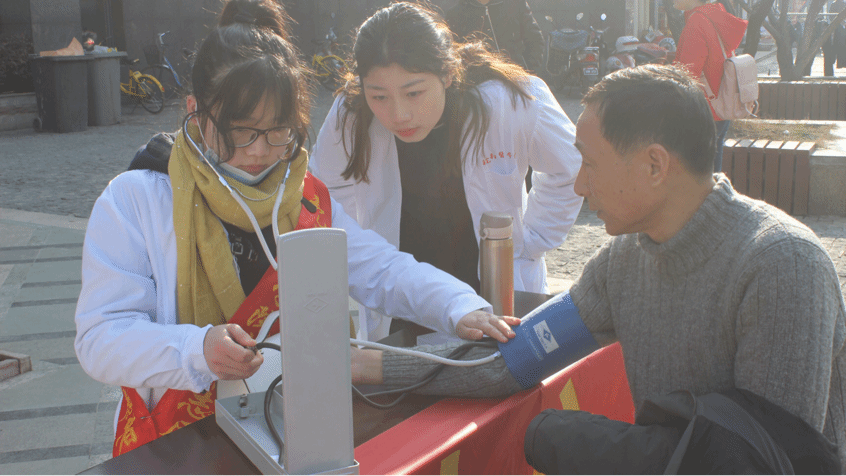 阳光和煦,微风轻柔,3月10日早8点,志愿者们或走进社区,摆开桌椅,拉起横幅,不急不躁认真细致地为社区居民测量血压,期间不乏志愿者们亲切的问候与关怀;或走上街道,积极分发传单,认真介绍春季流行疾病防控知识,指导人们做好预防措施,热心提醒社区人员注意合理饮食,并引导他们前往志愿服务台测量血压,关注身体健康状况;或耐心仔细地教老人们十式手部健康操,为其进行按摩解乏,并结合所学知识对老人提出的常见健康问题做出针对性解答,幸福的微笑洋溢在老人的脸庞。点滴活动,汇聚成集,丝丝奉献,传承千里,志愿者们以其饱满的热情与严谨的工作态度赢得了广大南街社区居民的夸赞与认可。