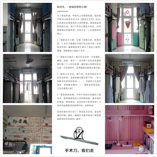 为营造团结、和谐、健康、向上的寝室文化氛围,使之成为员工素质养成的沃土;同时丰富同学们的老员工活,发挥寝室文化建设过程中员工的主体作用,利来国际2016级团总支举办以“清雅之室,医展风采”为主题的文明寝室创建活动。