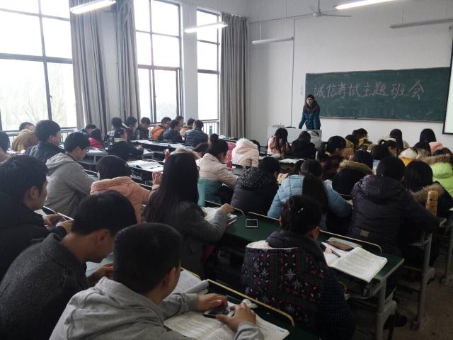 2013级团总支以班级为单位,召开关于“端正考风,诚信考试”的主题班会。通过视频观看、诚信宣讲等方式,向同学们强调了诚信考试的重要性,要求同学们遵守考场纪律,考出自己真实的水平;并就考试作弊的严重后果告诫大家。考试考出的是水平,诚信体现的是做人,我们要学会做人,以德为先,德才兼备,方能成才。同学们认真聆听,也纷纷表示经过学习,对于诚信有了更进一步的认识与体会。
