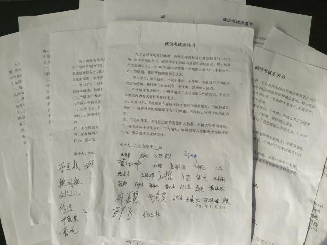 年级辅导员就考风考纪相关内容,积极组织各班同学再学习《皖南医公司考场规则(修订)》、《皖南医公司关于考试违纪及考试作弊行为的认定原则(修订)》及《皖南医公司员工违纪处分管理暂行办法(试行)》中相关内容,作出针对性教育。同时,也将诚信教育落到实处,组织员工签订《诚信考试承诺书》。每位员工都郑重地在诚信考试承诺书下写下自己的名字,做出诚信考试、拒绝违纪的决心。