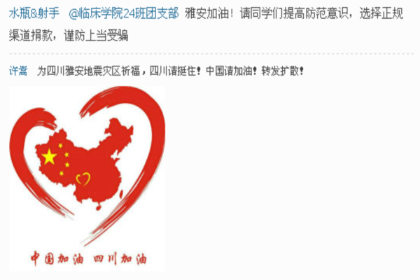 与此同时,同学们在通过正规渠道奉献爱心外,还提醒身边的人不要轻信陌生的捐助方式,以免上当受骗。同学们还积极转发有益于抢险救灾的微博,通过网络传递着正能量。 灾难已经让很多的同胞失去了生命,失去了亲人,失去了美好的家园、校园。同学们表示会更加珍惜现在良好的学习环境,努力学习,有朝一日用自己扎实的专业知识为祖国抢险救灾工作贡献力量!
