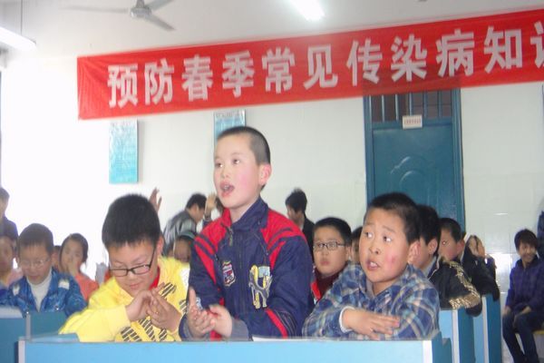 医学一系2009级24团支部的同学们来到了利民路小学开展春季常见传染病防治知识宣传活动。徐婷婷同学为小朋友们形象生动地讲述了春季易发生的流行病的自觉症状、临床表现以及如何及时正确地预防这些疾病等。为了活跃现场气氛,志愿者们采用互动的方法,让小朋友们认真思考,踊跃回答问题,并给回答正确的小朋友分发小礼品,使他们在获得知识的同时得到鼓励。