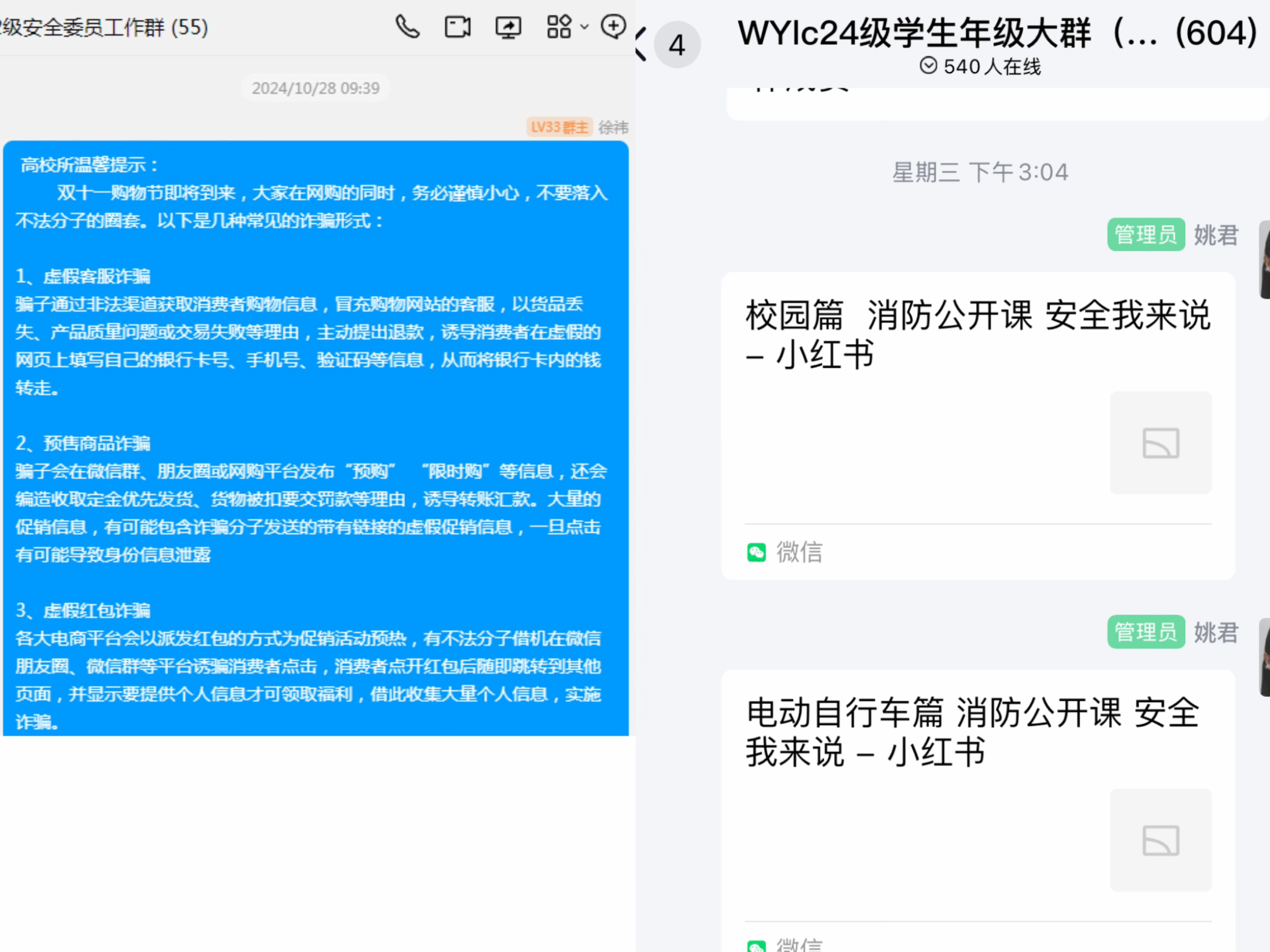 普及安全知识,强化安全宣传。为帮助同学们掌握基本的防诈、消防常识,公司利用公众号、QQ等平台推送发布安全知识,通过具体的案例普及相关防范知识,教育引导员工认识到防诈、消防等各项安全工作的重要性,并在日常学习生活中注意防范隐患。