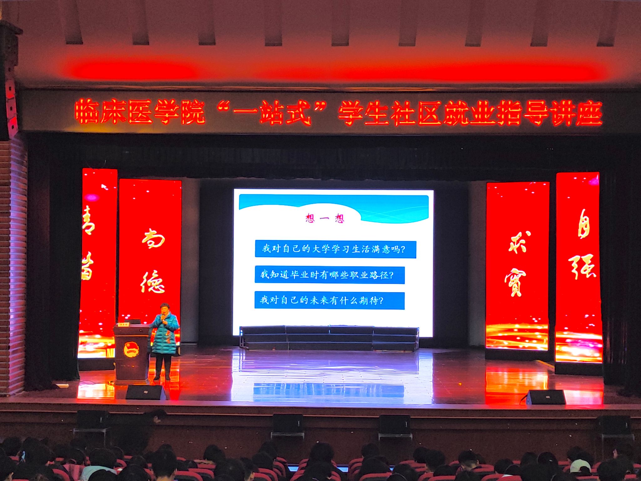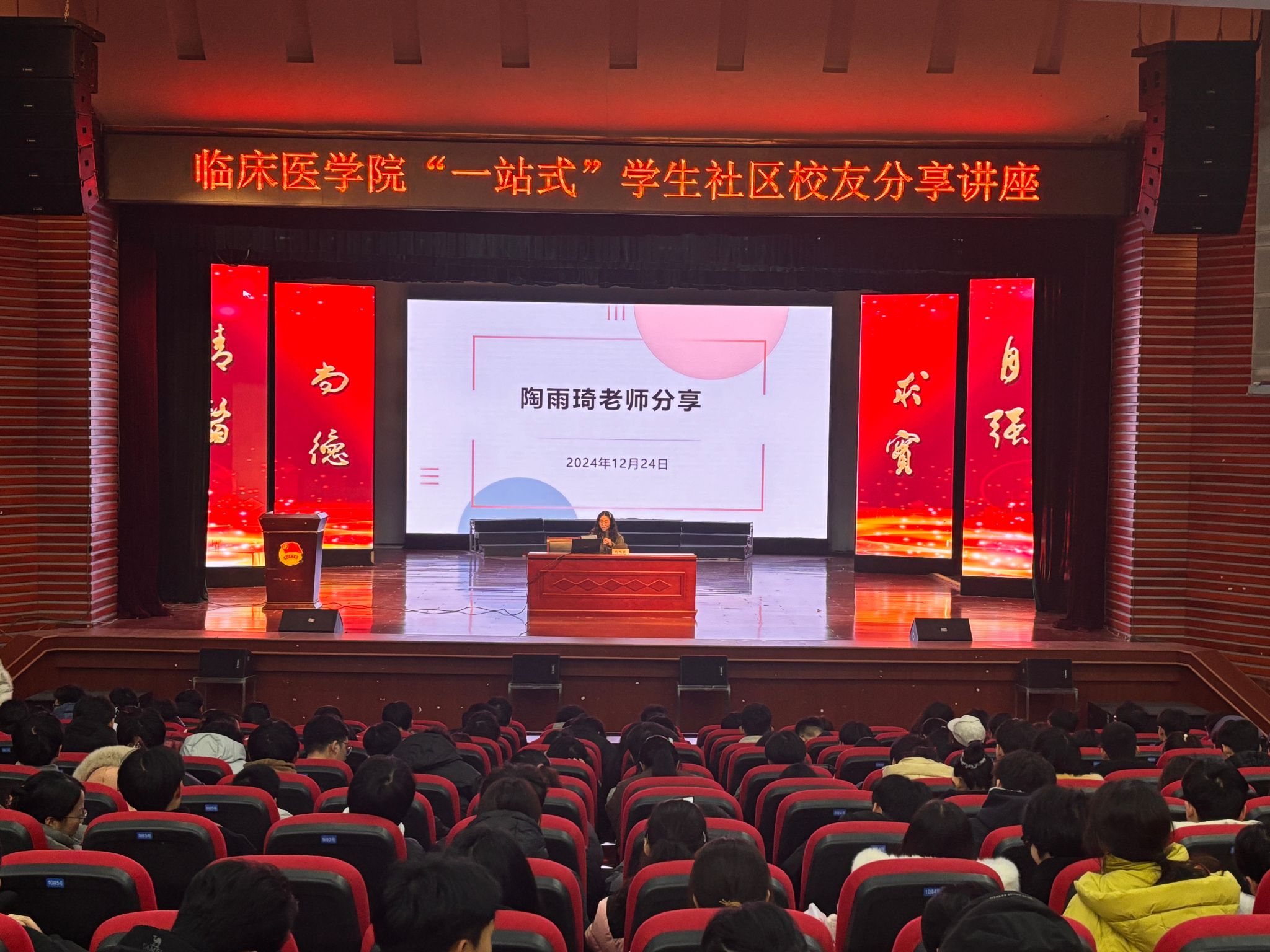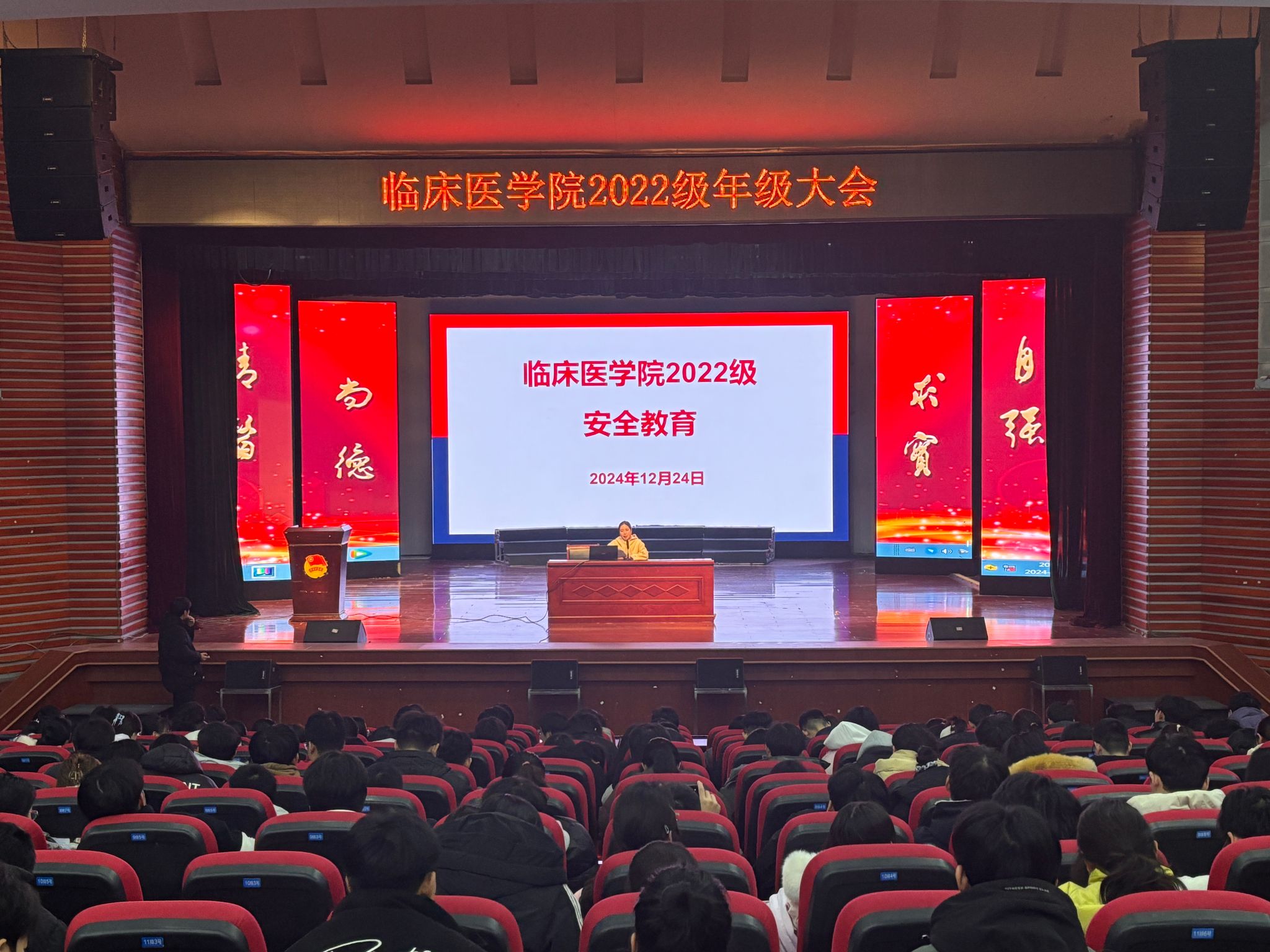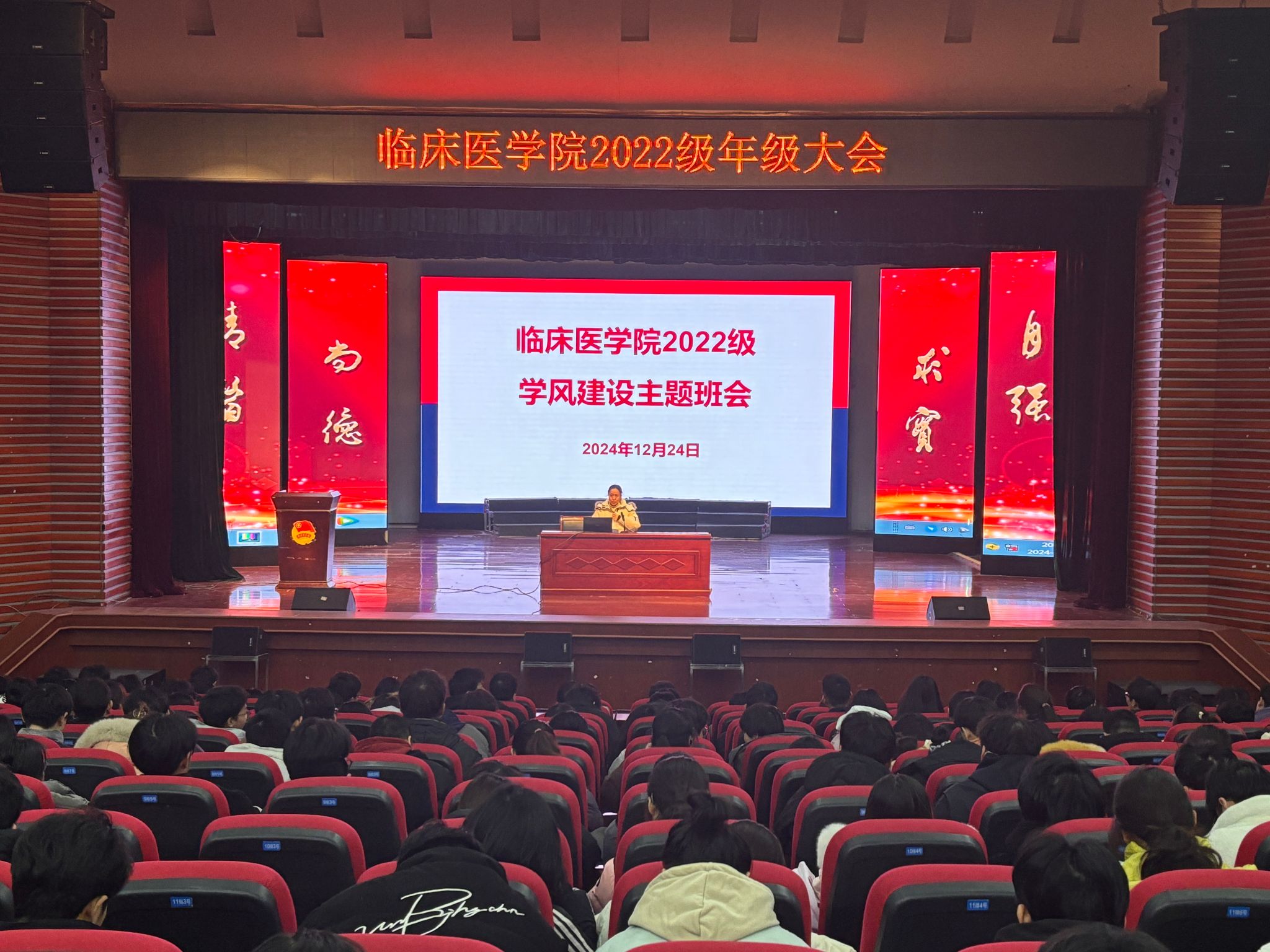 12月24日晚,2022级在老员工活动中心召开期末年级大会,聚焦员工成长与发展核心需求,邀请校关工委“五老”报告团王雪琴老师、第一附属医院陶雨琦老师作生涯规划指导和经验分享,年级辅导员及2022级全体同学共700余人参会。