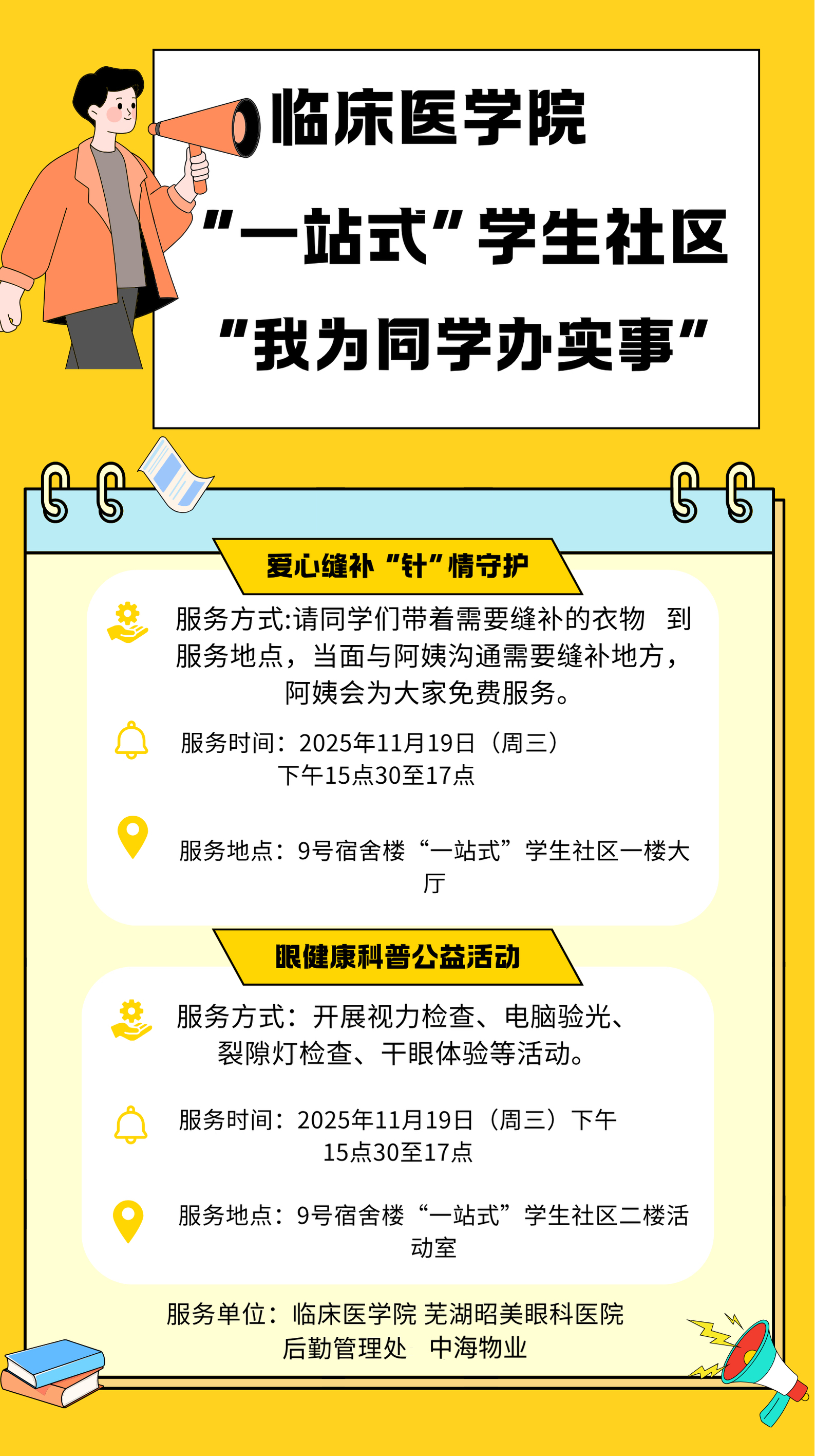 为深化“一站式”员工社区育人功能,聚焦员工实际需求,11月19日下午,利来国际联合后勤管理处、芜湖昭美眼科医院等在“一站式”员工社区组织开展爱心缝补与眼健康科普公益行动,以精准服务推动“我为同学办实事”走深走实。