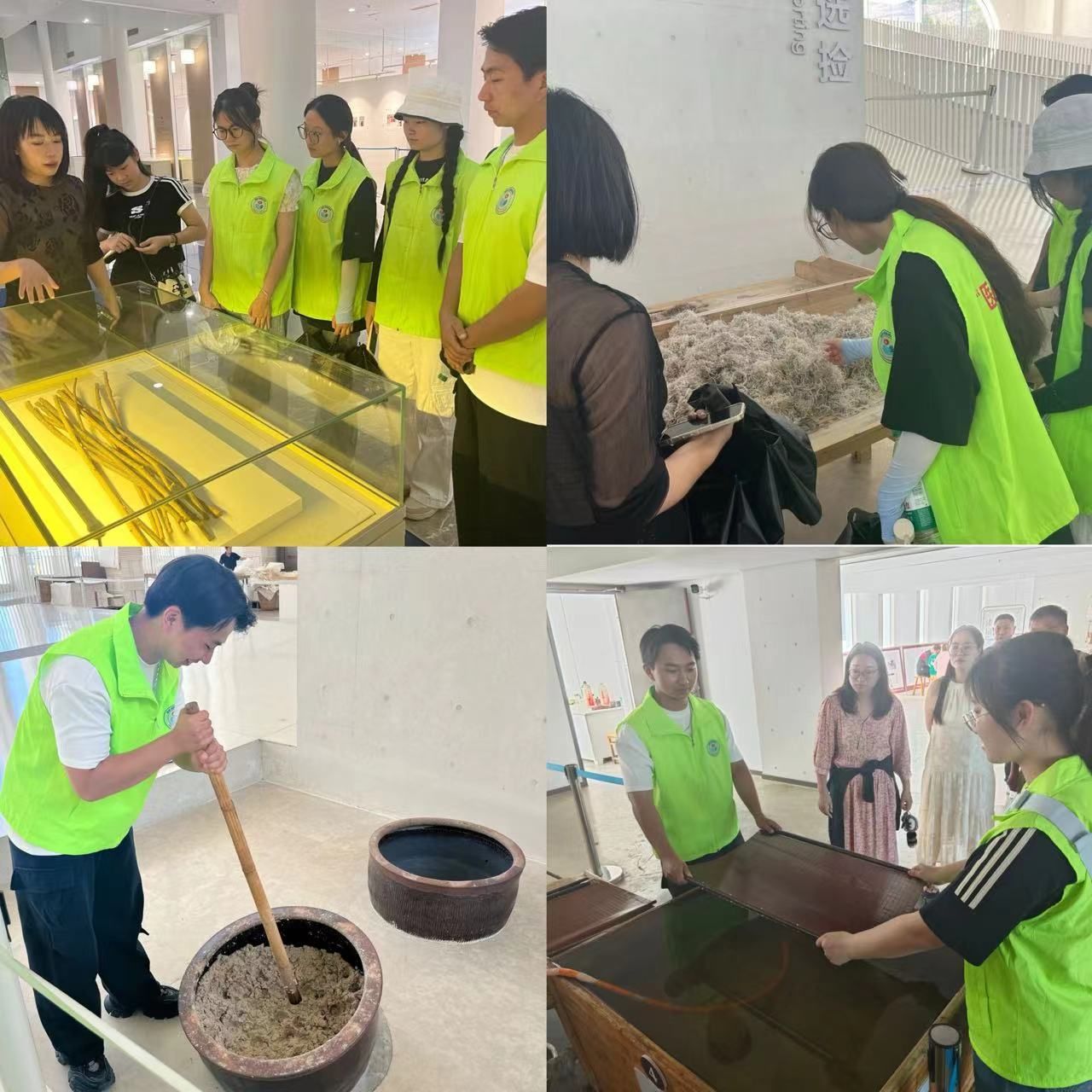 探秘古法,纸中乾坤。活动首站,团队成员们踏入历史悠久的宣纸文化园,在讲解员的带领下,参观园内珍藏的历代书画作品。一笔一划都浸透着宣纸独有的韵味与温度,同学们也领略到宣纸对于书画艺术传承的重要意义。与此同时,大家还亲身体验了宣纸的诞生过程。它们从最初融合的青檀树皮与沙田稻草,经过一系列操作步骤,成为一张张薄如蝉翼、韧似绸缎的纸张,团队成员也由此深刻体验到了宣纸制作工艺的不易。