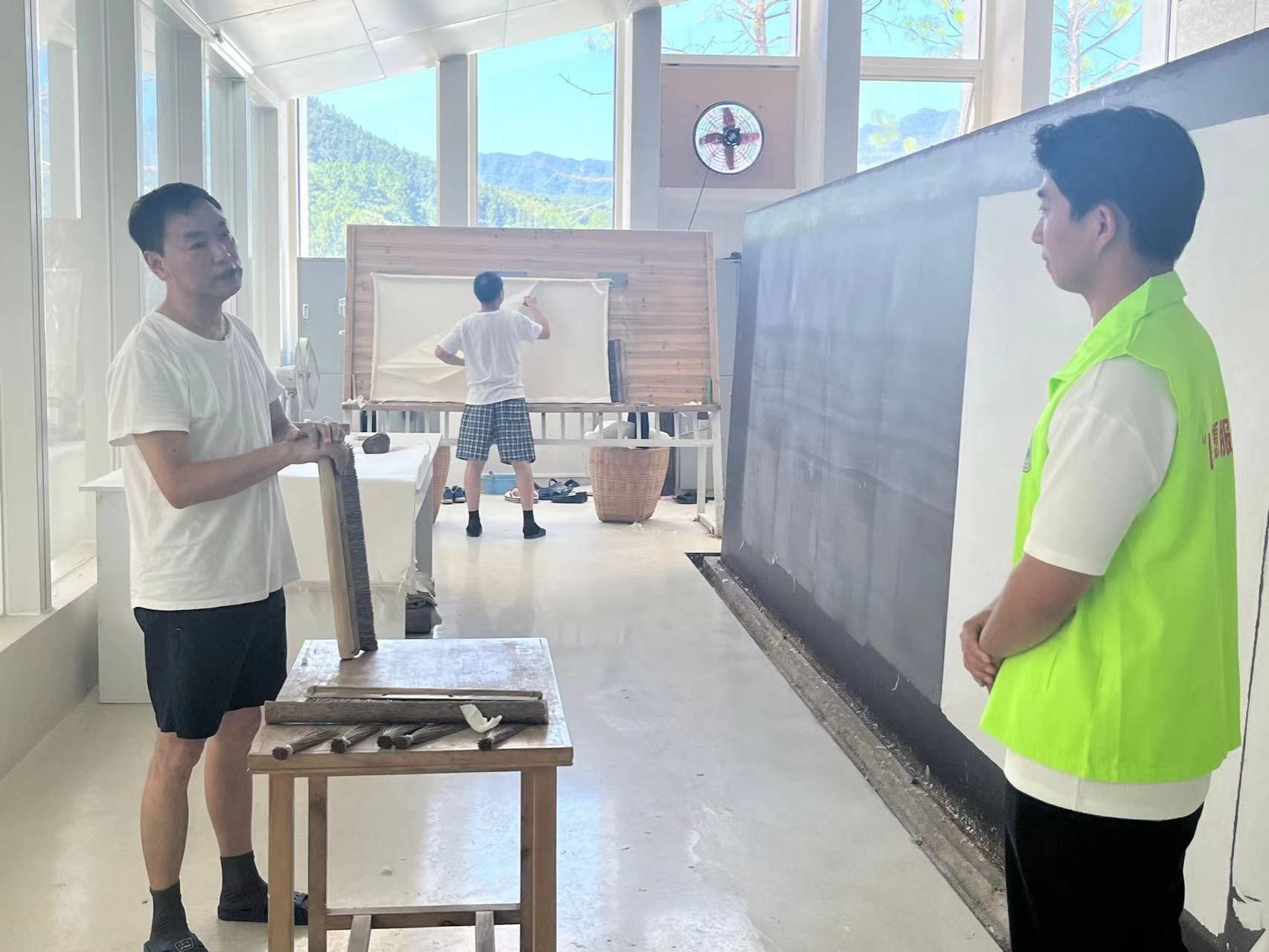 匠心对话,技艺传承。紧接着,团队成员一行人来到了毛胜利师傅的工作间。55岁的毛胜利师傅和宣纸打了37年的交道,并于2016年获得“大国工匠”的称号。毛师傅的工作间内摆放着一排排温度高达70℃的铁板墙,工作间里没有空调和电风扇,毛胜利师傅一刻不停地挥动着手中的毛刷,像施魔法般将一张张宣纸平铺开。毛胜利师傅以其深厚的造诣和满腔的热情,向队员们详细讲解了宣纸制作的七十二道工序,从选材、制浆、捞纸、晒纸到切纸、检纸,每一道都凝聚着匠人的心血与智慧。当团队成员询问支撑毛师傅坚持多年的动力时,毛师傅讲述了自己对宣纸文化传承的忧虑与希望,鼓励年轻人多了解、多学习,让这一传统技艺在新时代焕发新的生机。